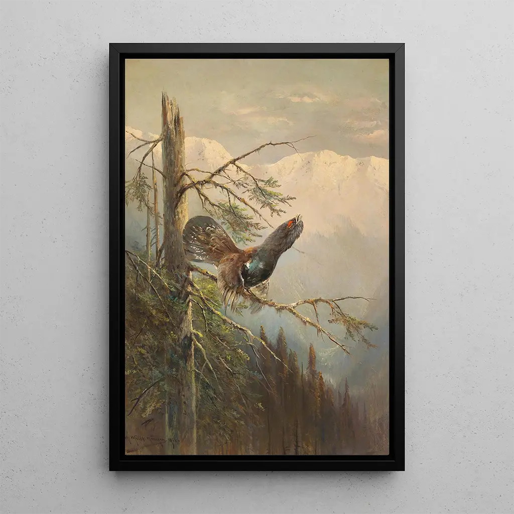 In dit boeiende kunstdruk dompelt Moritz Müller ons onder in een levendige scène waar de grote bosuil, een majestueus bosvogel, zich presenteert in een paringsdans. De levendige kleuren van zijn veren, variërend van bruin tot iriserend, creëren een opvallend contrast met het weelderige groen van zijn omgeving. Müller's techniek, die precisie en gevoeligheid combineert, maakt de sfeer van dit vergankelijke moment voelbaar. Elk detail, van de delicate veren tot de gracieuze bewegingen van de vogel, nodigt de kijker uit om de schoonheid van de natuur te bewonderen en de energie van deze vogel-dans te voelen.