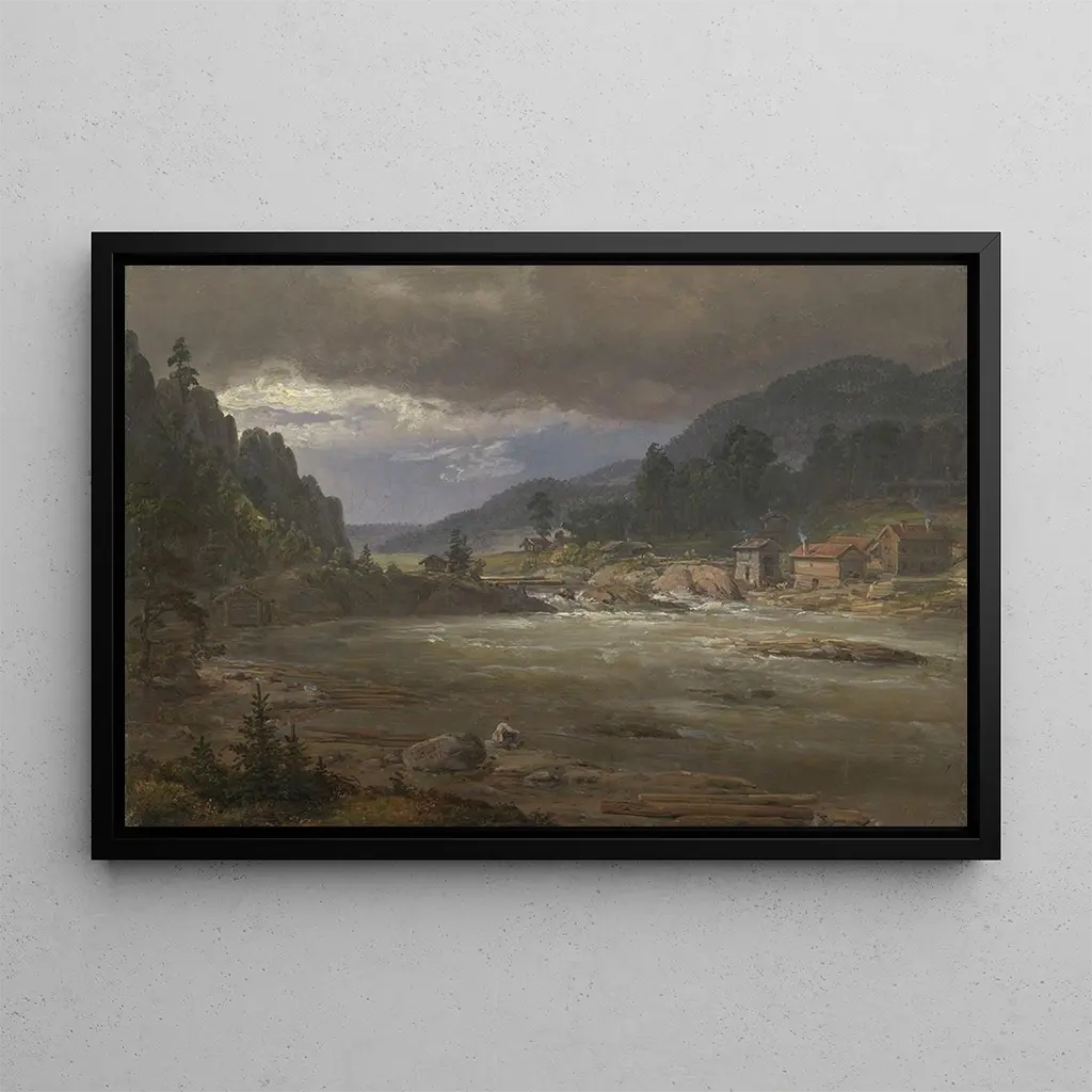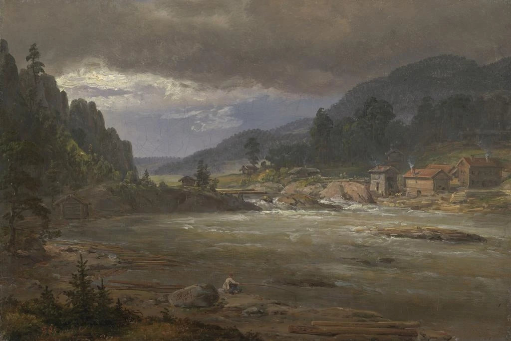 Johan Christian Dahl wordt beschouwd als een van de eerste landschapsschilder in Noorwegen, die een cruciale rol speelde in de opkomst van de Scandinavische romantiek in de 19e eeuw. Opgeleid in Dresden, laat hij zich inspireren door de grote Duitse meesters terwijl hij een eigen stijl ontwikkelt die de Noorse landschappen viert. Dahl wist de essentie van de wilde natuur vast te leggen, waardoor hij vele hedendaagse en toekomstige kunstenaars beïnvloedde. "Hellefossen nabij Hokksund" is een perfect voorbeeld van zijn vaardigheid om de majesteit van de Noorse landschappen te vertalen, terwijl hij elementen van de Europese romantische cultuur integreert.