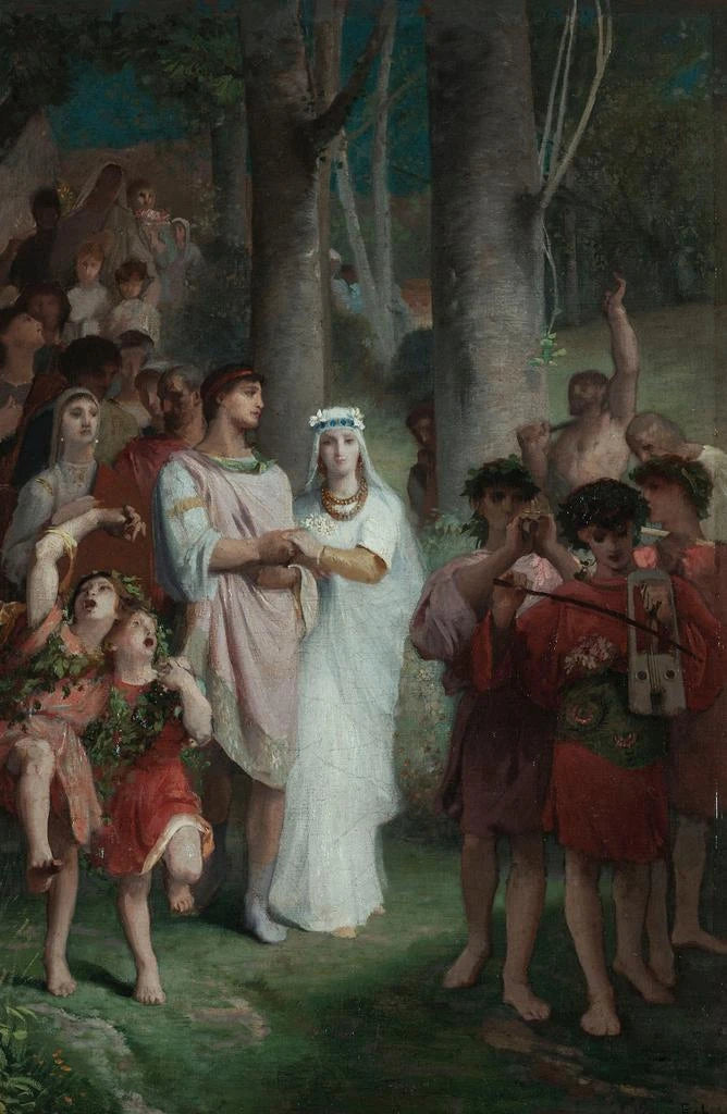 In dit levendige kunstwerk vangt Émile Lévy de essentie van een huwelijk, een moment vol emotie en geluk. De heldere kleuren, variërend van delicate rozen tot diepe blauwen, creëren een feestelijke en warme sfeer. Lévy's techniek, waarbij olie en delicate penseelstreken worden gecombineerd, brengt de personages tot leven en maakt ze bijna tastbaar. De stralende gezichten en tedere gebaren roepen een levenscène op waarin de liefde triomfeert. Elk detail, van bloemen tot kostuums, draagt bij aan een harmonieuze compositie en nodigt de kijker uit om onder te dompelen in deze tijdloze viering.