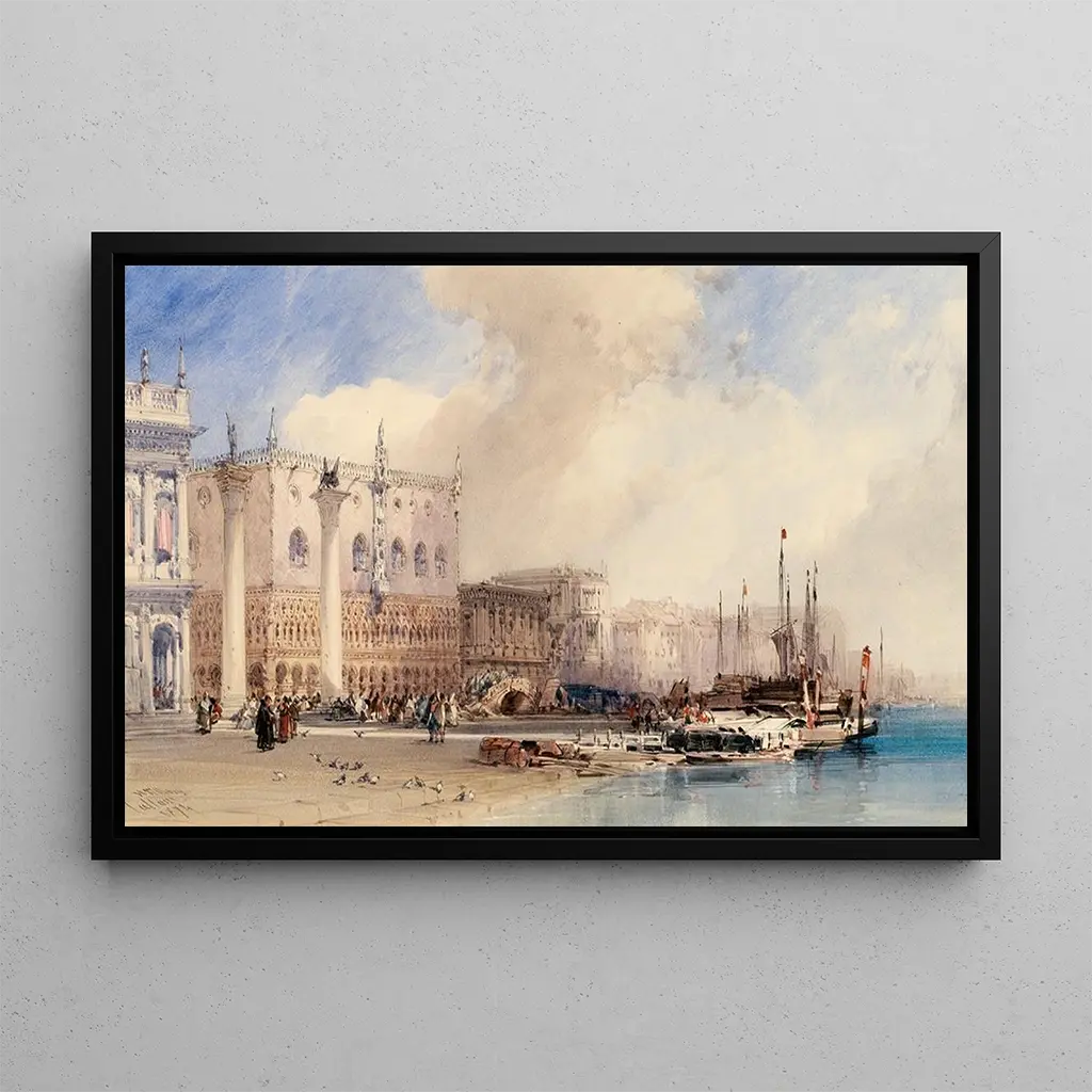 Het schilderij "Le Palais des Doges, Venise" van William Callow vangt de essentie van Venetiaanse rust. De compositie benadrukt de majestueuze architectuur van het paleis, badend in een gouden licht dat de reflecties van de kanalen oproept. De nuances van blauw en beige vermengen zich harmonieus, waardoor een sfeer ontstaat die zowel rustgevend als levendig is. Callow gebruikt olieverftechnieken die de architectonische details tot leven brengen, terwijl hij tegelijkertijd een emotionele diepte aan de scène toevoegt. Dit schilderij nodigt de kijker uit om onder te dompelen in de tijdloze elegantie van Venetië, waar elke penseelstreek een verhaal vertelt.
