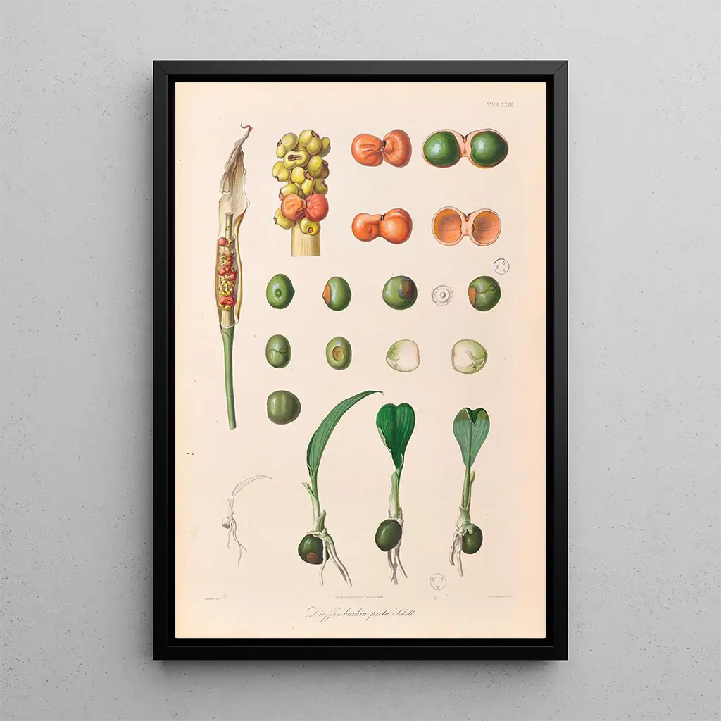 De kunstdruk van Icones Aroidearum Pl27 is een fascinerend werk dat de kijker onderdompelt in het weelderige universum van tropische planten. De levendige kleuren, variërend van diepe groenen tot sprankelende tinten van geel en rood, creëren een levendige en dynamische sfeer. De graveertechniek die door Schott wordt gebruikt, maakt het mogelijk om elk detail van de bladeren en bloemen met opmerkelijke precisie weer te geven, en nodigt uit tot het verkennen van de schoonheid van de natuur. Dit werk, zowel wetenschappelijk als artistiek, roept een gevoel van verwondering op over de diversiteit van plantensoorten.