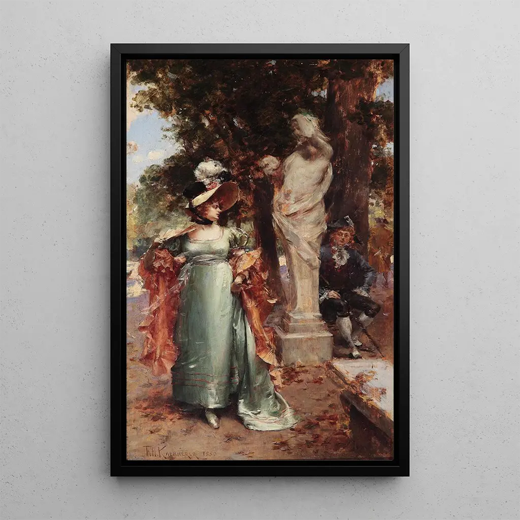Dans le Parc : une escapade bucolique "Dans le Parc" est une œuvre qui évoque une douce promenade au cœur de la nature. Frederik Hendrik Kaemmerer y capture des figures humaines évoluant dans un paysage verdoyant, où la lumière filtre à travers les feuillages. Les couleurs vives et les jeux d'ombre et de lumière créent une atmosphère paisible et rêveuse. La composition, équilibrée et harmonieuse, invite le spectateur à s'imaginer dans ce parc, à ressentir la brise légère et à entendre le chant des oiseaux. Kaemmerer, avec son style distinctif, réussit à immortaliser la beauté éphémère d'un moment de sérénité. Frederik Hendrik Kaemmerer : un pionnier du réalisme Artiste néerlandais du XIXe siècle, Frederik Hendrik Kaemmerer est reconnu pour son approche réaliste et ses scènes de genre. Sa carrière est marquée par des influences variées, allant des traditions artistiques néerlandaises aux inspirations exotiques rencontrées lors de ses voyages. Kaemmerer a su s'imposer dans le monde de l'art grâce à sa capacité à représenter des moments de la vie quotidienne avec une grande finesse. Son œuvre "Dans le Parc" témoigne de son talent à capturer la beauté des interactions humaines dans des environnements naturels, consolidant ainsi son statut d'artiste incontournable de son époque. Une acquisition décorative aux multiples atouts La reproduction de "Dans le Parc" est un choix parfait pour embellir votre intérieur. Que ce soit dans un salon, un bureau ou une chambre, ce tableau apporte une touche de fraîcheur et de tranquillité. Sa qualité d'impression assure une fidélité remarquable aux détails et aux couleurs de l'œuvre originale, permettant d'apprécier pleinement le génie de Kaemmerer. Avec son esthétique séduisante, cette toile s'adapte à divers styles de décoration, du traditionnel au moderne, faisant d'elle un ajout précieux à votre collection artistique.