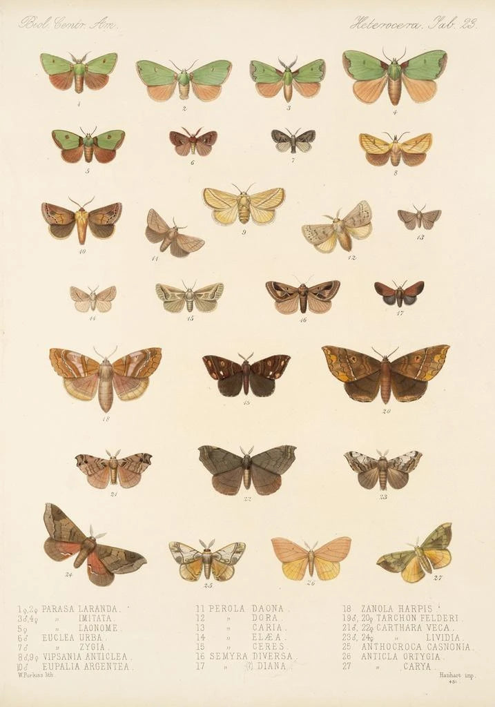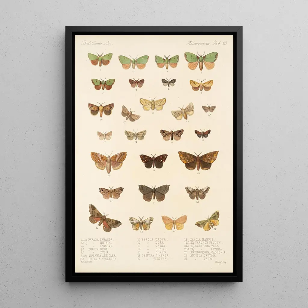 De kunstdruk Insecta Lepidoptera Heterocera Pl 023 toont een fascinerende variëteit aan nachtvlinders, elk afgebeeld met opmerkelijke precisie. De nuances in kleuren en de complexe patronen van de vleugels creëren een dynamische compositie die de aandacht trekt. Dit werk roept een sfeer van nieuwsgierigheid en verwondering op, en nodigt uit om de rijkdom van de biodiversiteit te verkennen. De precisie van de details, gecombineerd met een artistieke benadering, viert de schoonheid van insecten en biedt tegelijkertijd een poëtische visie op hun natuurlijke habitat.