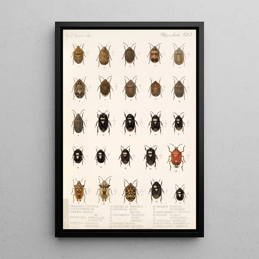 Insecta Rhynchota Hemiptera Heteroptera Pl 02 : een viering van de biodiversiteit L'œuvre "Insecta Rhynchota Hemiptera Heteroptera Pl 02" de Frederick DuCane Godman est une véritable ode à la richesse du monde insecte. Deze kunstdruk benadrukt minutieuze details van de hemiptera, deze fascinerende insecten die onze planeet bevolken. De levendige kleuren en de delicate nuances van de vleugels en lichamen van de insecten worden met opmerkelijke precisie weergegeven, waardoor een sfeer ontstaat die zowel wetenschappelijk als artistiek is. De compositie, zorgvuldig samengesteld, trekt de aandacht en nodigt uit tot een aandachtige verkenning van vormen en texturen, waardoor de verborgen schoonheid van deze vaak onbekende wezens wordt onthuld. Frederick DuCane Godman : een pionier in de artistieke entomologie Frederick DuCane Godman, naturalist en illustrator uit de 19e eeuw, speelde een essentiële rol in de documentatie van de biodiversiteit. Zijn werk past binnen de Victoriaanse beweging, waar wetenschap en kunst samenkomen om het publiek te onderwijzen over de natuur. Godman reisde de wereld rond, geïnspireerd door de landschappen en soorten die hij ontmoette, wat zijn illustraties verrijkte. Zijn werken, waaronder "Insecta Rhynchota Hemiptera Heteroptera Pl 02", zijn niet alleen wetenschappelijke studies, maar ook getuigenissen van verwondering over de natuur. Als kunstenaar wist hij de essentie van zijn onderwerpen vast te leggen met een unieke gevoeligheid, waardoor hij een belangrijke figuur werd in het veld van de naturalistische illustratie. Een decoratieve aanwinst met vele voordelen De kunstdruk van "Insecta Rhynchota Hemiptera Heteroptera Pl 02" is een ideale decoratieve keuze voor diverse ruimtes, of het nu een woonkamer, kantoor of slaapkamer betreft. Zijn verfijnde esthetiek en zijn boeiende details maken er een schilderij van dat nieuwsgierigheid en gesprekken oproept. De kwaliteit van de afdruk garandeert een opmerkelijke trouw aan de kleuren en details van het originele werk, wat zorgt voor een verrijkende visuele ervaring. Door deze doek in uw inrichting te integreren, brengt u een vleugje elegantie en cultuur aan, terwijl u de schoonheid van de natuur en de wetenschap viert — een echte troef voor elke kunst- en biodiversiteitsliefhebber.