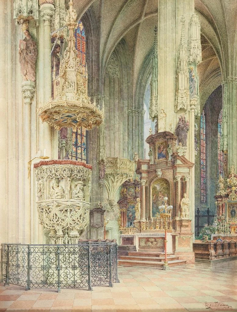 Interieur van de Sint-Etiennekathedraal met de pelgrimsbank - Richard Moser Source: Intérieur de la cathédrale Saint-Étienne avec la chaire des pèlerins - Richard Moser