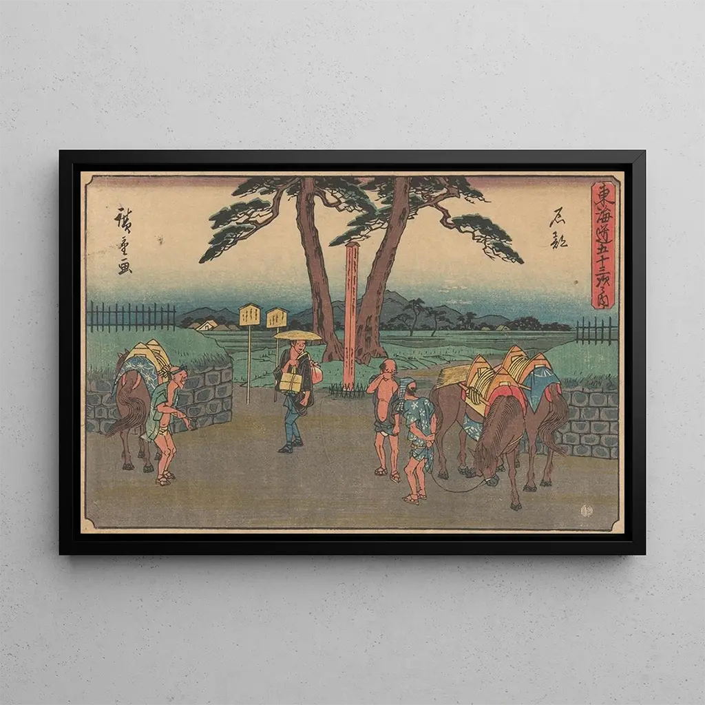 De Ishibe-kunstdruk van Andō Hiroshige brengt ons in een wereld van rust en schoonheid. Dit iconische werk, afkomstig uit de serie "Uitzichten van de vijftig drie stations van de Tōkaidō", toont een rustige scène waarin de harmonie tussen mens en natuur wordt benadrukt. De zachte kleuren en de delicate nuances van blauw en groen creëren een rustgevende sfeer, terwijl de houtsnijkunst, kenmerkend voor ukiyo-e, het geheel een unieke textuur geeft. Elk detail, van de silhouetten van de personages tot de omliggende natuurlijke elementen, roept een uitnodiging op tot contemplatie en ontsnapping.