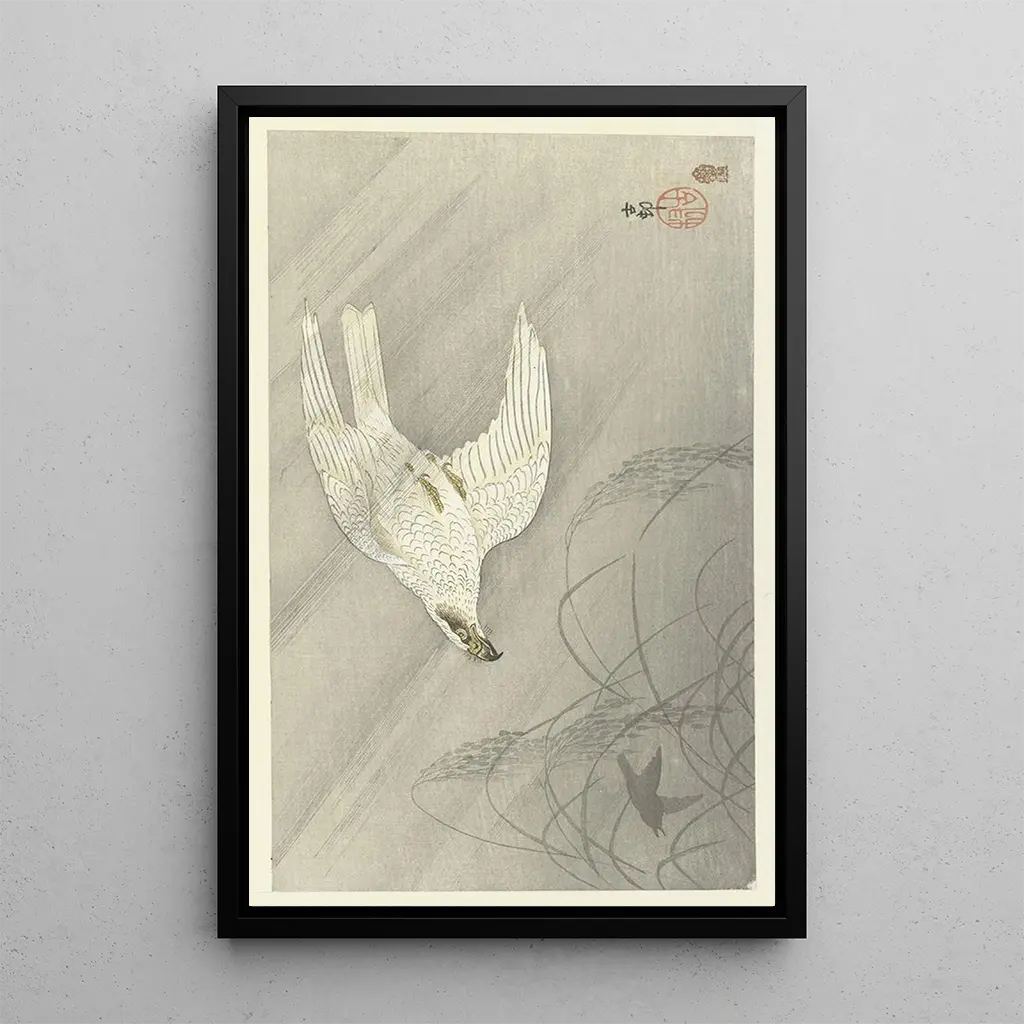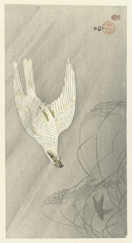 Ohara Koson, een iconische figuur van de ukiyo-e, wist zich te vestigen in de wereld van de Japanse kunst aan het begin van de 20e eeuw. Zijn carrière bloeide in een overgangsperiode, waarin westerse invloeden begonnen te mengen met Japanse tradities. Koson werd vooral beïnvloed door de natuur en dieren, die hij met opmerkelijke fijnheid afbeeldde. Zijn werken, waaronder "Faucon jager", getuigen van zijn talent en zijn inzet voor de Japanse esthetiek, terwijl hij elementen van moderniteit integreerde.
