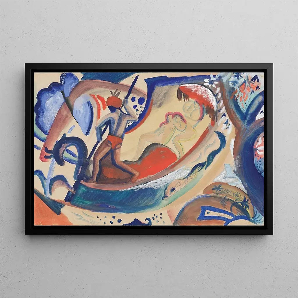 Cette kunstdruk d'August Macke, "Jeunes filles nues dans la barque", évoque une scène estivale empreinte de légèreté et de joie. Les figures féminines, délicatement représentées, flottent sur l'eau d'un lac paisible, entourées de couleurs vives et de formes organiques. Macke, avec sa palette audacieuse et ses coups de pinceau expressifs, capture l'insouciance de la jeunesse et la beauté de la nature. L'atmosphère de cette œuvre est à la fois rêveuse et vivante, invitant le spectateur à ressentir la fraîcheur de l'air et la douceur des rayons du soleil.