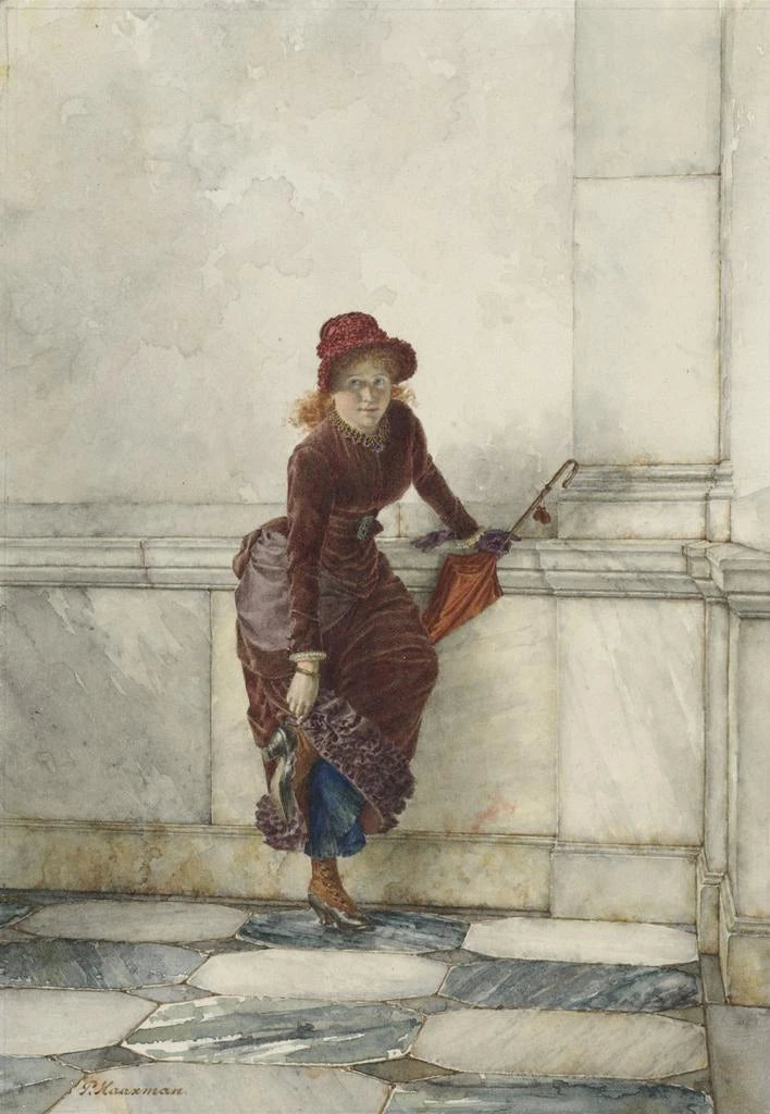Schilderij Jonge vrouw staand tegen een muur leunend - Pieter Haaxman | Kunstdruk