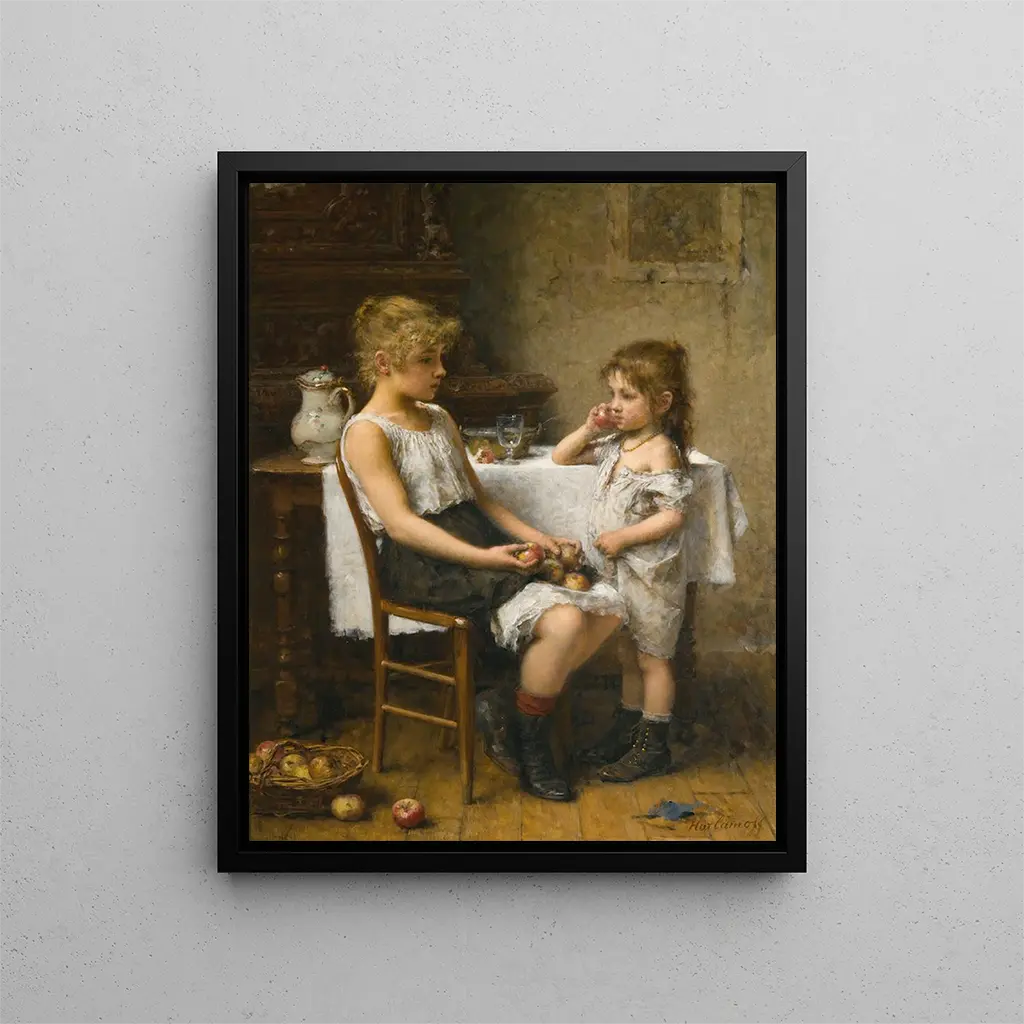 Reproductie Kies appels - Alexei Harlamoff – Boeiende introductie In het fascinerende universum van kunst slagen sommige werken erin de essentie van het dagelijks leven vast te leggen, terwijl ze de tijd en ruimte overstijgen. "Kies appels" van Alexei Harlamoff is hier een perfect voorbeeld van. Dit doek, doordrenkt met zachtheid en verfijning, biedt een duik in een eenvoudig moment dat geladen is met betekenissen. Door naar dit werk te kijken, wordt de kijker meegenomen naar een wereld waar natuur en mens harmonieus verweven zijn, en de schoonheid van alledaagse dingen onthullen. De scène toont een jong meisje, geconcentreerd op het kiezen van fruit, en nodigt uit tot nadenken over de kleine beslissingen die ons bestaan vormgeven. Het subtiele licht, de pastelkleuren en de fijnheid van de details maken van dit werk een waar meesterwerk, een uitnodiging tot contemplatie. Stijl en uniekheid van het werk De stijl van Alexei Harlamoff onderscheidt zich door zijn vermogen om realisme en impressionisme te combineren, waardoor een sfeer ontstaat die doordrenkt is van poëzie. In "Kies appels" gebruikt de kunstenaar een palet van zachte kleuren die de warmte van een zonnige namiddag oproepen. De tinten groen van de bladeren, het heldere rood van de appels en de delicate teint van het jonge meisje mengen zich tot een visueel boeiend harmonieus geheel. Het licht speelt een centrale rol in dit werk, subtiel de vormen verlichtend en delicate schaduwen scheppend die diepte aan de scène toevoegen. Harlamoff slaagt erin niet alleen de verschijning van de objecten vast te leggen, maar ook de emotie die ervan uitgaat. De attente houding van het jonge meisje, haar geconcentreerde blik, suggereren een intieme connectie met het fruit dat ze kiest, en onderstrepen zo het belang van alledaagse gebaren. De kunstenaar en zijn invloed Geboren in Rusland in 1840, wist Alexei Harlamoff zich te vestigen als een van de meest invloedrijke kunstenaars van zijn tijd. Opgeleid aan de Academie voor Schone Kunsten in Sint-Petersburg, ontwikkelde hij een unieke stijl die de academische traditie combineert met de nieuwe artistieke trends van die tijd. Harlamoff was bijzonder getroffen door de schoonheid van het landelijke landschap en de eenvoud van het dagelijks leven, thema's die terugkeren in zijn werk.