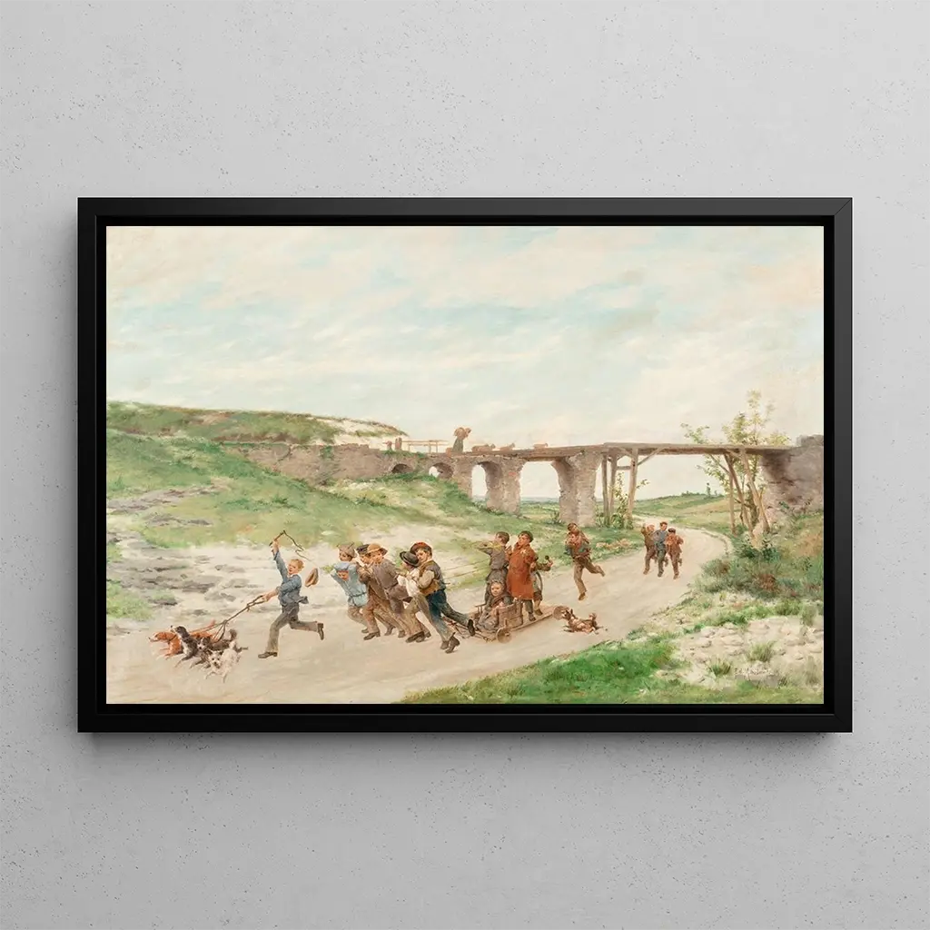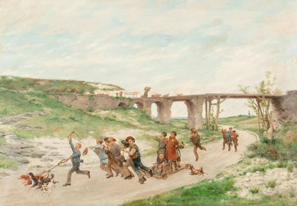 "Enfants Jouant" d'Antoine Édouard Joseph Moulinet capture un instant de pure joie, où des enfants s'amusent dans un cadre bucolique. Les couleurs vives et les expressions enjouées des jeunes protagonistes transmettent une atmosphère de bonheur et d'insouciance. La technique de Moulinet, caractérisée par des coups de pinceau fluides et une attention particulière aux détails, crée une scène vivante et dynamique. Ce tableau évoque non seulement l'innocence de l'enfance, mais aussi la beauté des moments simples de la vie, invitant le spectateur à se remémorer ses propres souvenirs d'enfance.