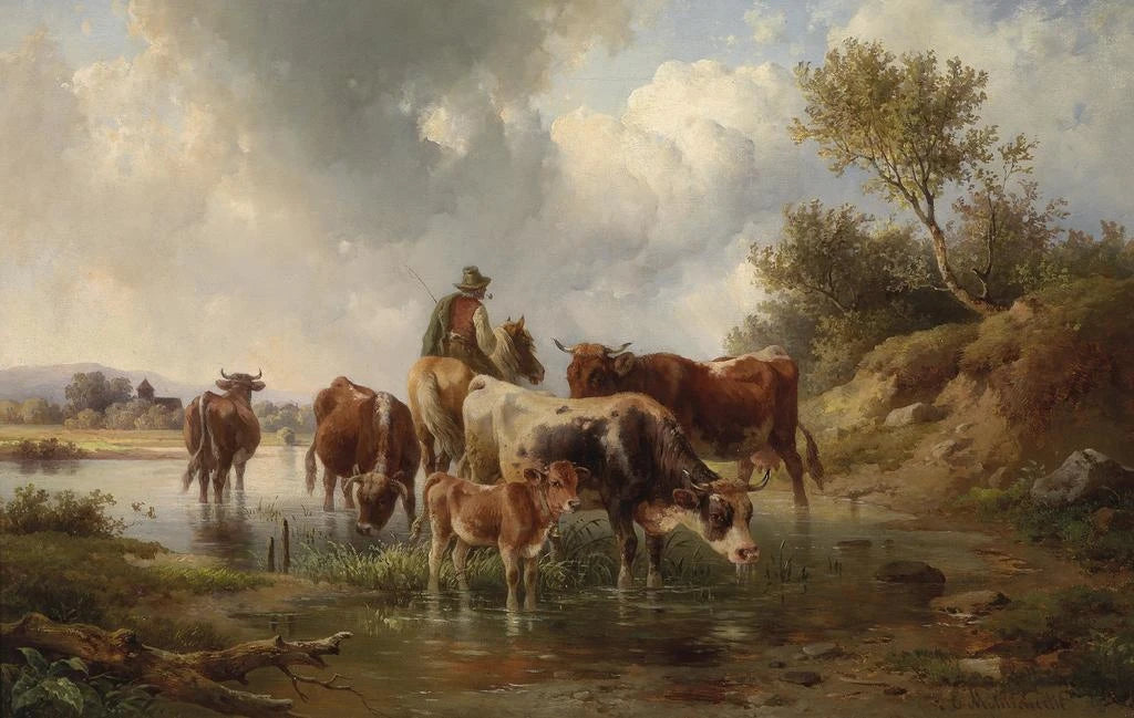 Varken met herders bij de beek: een levendige landelijke scène De "Varken met herders bij de beek" van Edmund Mahlknecht toont een levendige pastorale scène, waar natuur en mens harmonieus samenleven. De aardse kleuren en groentinten illustreren een levendig plattelandslandschap, terwijl het zachte zonlicht de personages en dieren streelt. Mahlknecht's techniek, gekenmerkt door expressieve penseelstreken, brengt dit doek tot leven en creëert een sfeer van rust en eenvoud. Elk element, van de rustige varken tot de oplettende herders, draagt bij aan een visueel verhaal dat de schoonheid van het plattelandsleven viert. Edmund Mahlknecht: een getuige van het landelijke leven Edmund Mahlknecht, actief in de 19e eeuw, is een kunstenaar wiens werken de tradities en landschappen van het Europese platteland weerspiegelen. Geïnspireerd door de romantische beweging, wist hij momenten uit het dagelijks leven met een unieke gevoeligheid vast te leggen. Zijn periode wordt gekenmerkt door een terugkeer naar de natuur en een waardering voor landelijke scènes, wat getuigt van een tijd waarin industrialisatie begon het landschap te transformeren. Mahlknecht herinnert ons door zijn kunst aan het belang van natuur en menselijke activiteiten, waardoor hij een essentiële kunstenaar is om deze overgang te begrijpen. Een decoratief stuk met vele voordelen De kunstdruk van de "Varken met herders bij de beek" is een decoratief stuk dat een rustieke en warme sfeer aan uw interieur toevoegt. Perfect voor een woonkamer, keuken of kantoor, roept dit doek de sereniteit van het plattelandsleven op. De kwaliteit van de kunstdruk garandeert een nauwkeurige weergave van de details en kleuren van het originele werk, terwijl het ook een esthetisch aantrekkelijk element biedt dat uw gasten zal bekoren. Door dit kunstwerk in uw inrichting te integreren, creëert u een gastvrije ruimte vol charme en gezelligheid.
