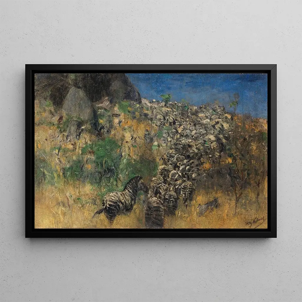 Koeper van vluchtende zebra's: een wilde dans in de savanne In deze kunstdruk van het werk "Koeper van vluchtende zebra's" legt Wilhelm Kuhnert de essentie van het wilde leven vast. De zebra's, die in volle vaart zijn, worden weergegeven met een verbluffende dynamiek, hun zwarte en witte strepen vormen een opvallend contrast met het gouden landschap van de savanne. De techniek van de kunstenaar, die realisme en impressionisme combineert, geeft een levendige sfeer aan de scène en nodigt de kijker uit om de urgentie en vrijheid van deze majestueuze dieren te voelen. De kleurnuances, variërend van warme bruintinten tot zachte groenen, voegen diepte toe aan het kunstwerk en maken van deze doek een ware oproep tot ontsnapping. Wilhelm Kuhnert: een meester van de wilde fauna Wilhelm Kuhnert, geboren in 1865, is een Duitse schilder die bekend staat om zijn werken gewijd aan de fauna. Geïnspireerd door zijn reizen in Afrika, wist hij de schoonheid van de dieren in hun natuurlijke habitat nauwkeurig vast te leggen. Zijn stijl, geworteld in het realisme, onderscheidt zich door een minutieuze aandacht voor details en een diepgaand begrip van diergedrag. Kuhnert was een pionier in de voorstelling van het wilde leven, en zijn werk heeft een significante invloed gehad op de dierenkunst aan het begin van de 20e eeuw. Zijn werken blijven kunstenaars en kunstliefhebbers inspireren en getuigen van het belang van zijn nalatenschap. Een decoratief stuk met vele voordelen De kunstdruk van de "Koeper van vluchtende zebra's" is een decoratief item dat perfect past in diverse ruimtes, of het nu een woonkamer, kantoor of slaapkamer is. De kwaliteit van de afdruk garandeert een trouwheid aan de kleuren en details van het originele kunstwerk, wat zorgt voor een onmiskenbare esthetische aantrekkingskracht. Door voor dit schilderij te kiezen, voegt u een vleugje elegantie en natuur toe aan uw interieur, terwijl u gesprekken op gang brengt over de schoonheid van de fauna. Deze doek is niet alleen een decoratief element, maar ook een uitnodiging om de majesteit van de dierenwereld te verkennen.