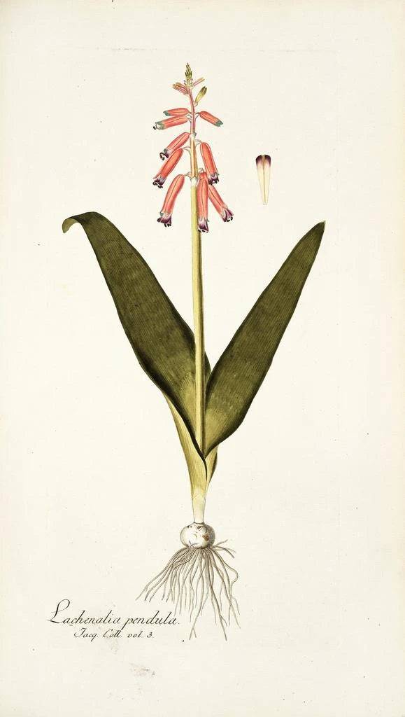 Nikolaus Joseph Freiherr von Jacquin, botanist en kunstenaar uit de achttiende eeuw, speelde een essentiële rol in de studie van exotische planten. Opgeleid aan de Universiteit van Wenen, reisde hij de wereld rond, onder andere in Amerika en Afrika, om specimens te verzamelen en te documenteren. Zijn wetenschappelijke aanpak, gecombineerd met een scherp artistiek gevoel, heeft bijgedragen aan de bekendheid van vele soorten, waaronder de Lachenalia pendula. In die tijd was de botanica in volle bloei, en Jacquin wist wetenschappelijke strengheid te combineren met esthetiek, waardoor hij zijn tijd markeerde met zijn bijdragen aan kunst en wetenschap.