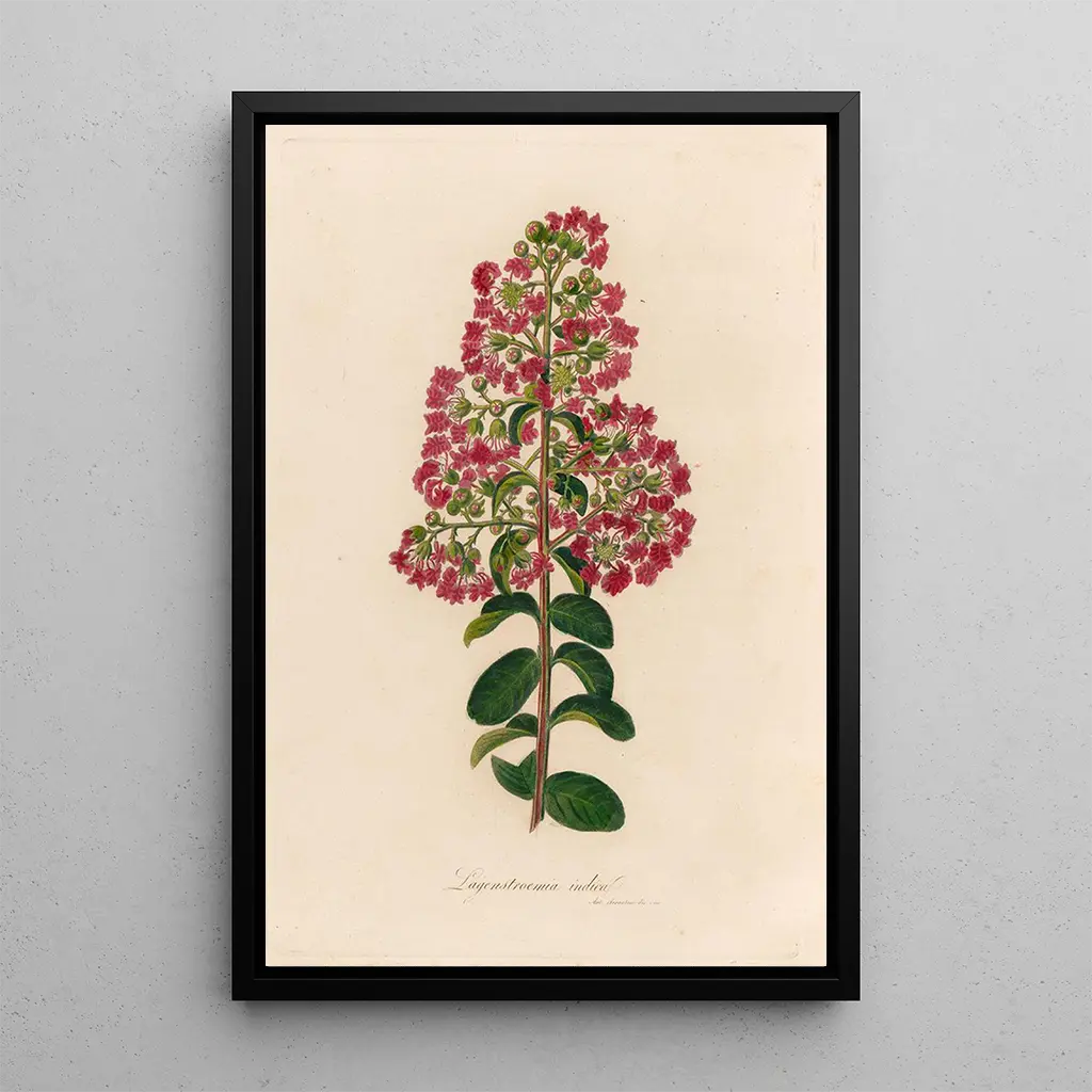 Lagenstroemia indica, vaak bekend als crêpe myrte, is een kunstdruk die de pracht van exotische bloemen viert. Met zijn nuances van roze, violet en wit roept deze reproductie een gevoel van sereniteit en harmonie op. De gebruikte schildertechniek benadrukt de delicate texturen van de bloemblaadjes en bladeren, waardoor een bijna tastbare sfeer ontstaat. Elk detail is zorgvuldig weergegeven, waardoor de kijker wordt uitgenodigd in een betoverend bloemrijk universum.