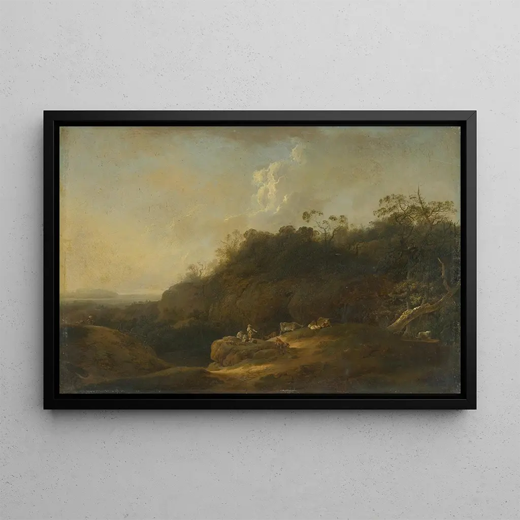 De kunstdruk van "Paysage avec berger" van Jan Wils dompelt ons onder in een pastoralistisch schilderij waar rust de boventoon voert. De aardse tinten en de nuances van groen roepen een ongerepte natuur op, terwijl de aanwezigheid van de herder, symbool van vrede en eenvoud, het werk verankert in een idyllische realiteit. De techniek van Wils, gekenmerkt door vloeiende penseelstreken en zacht licht, creëert een warme en uitnodigende sfeer. Elk element van het landschap, van majestueuze bomen tot golvende heuvels, draagt bij aan een visuele harmonie die uitnodigt tot contemplatie en ontsnapping.