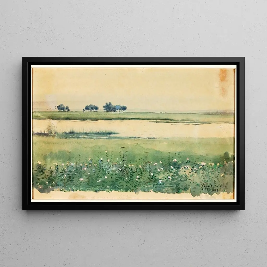 In deze kunstdruk van het schilderij Landschap met moeras neemt De Lancey Gill ons mee naar een rustige wereld waar de natuur bloeit. De zachte kleuren en de tinten groen vermengen zich harmonieus, waardoor een rustgevende sfeer ontstaat. De techniek van Gill, gekenmerkt door delicate penseelstreken, brengt elk element van het landschap tot leven, van de reflecties in het water tot de weelderige bladeren. Dit kunstwerk nodigt uit tot contemplatie en biedt de kijker een moment van rust, als een open raam naar een idyllische wereld.