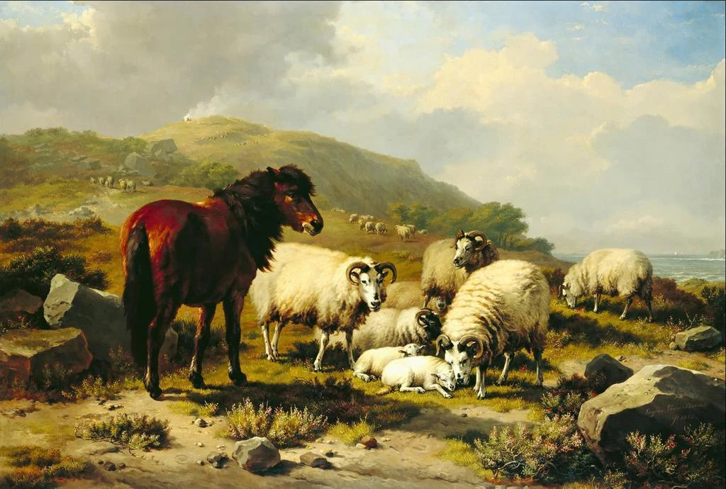 Eugène Joseph Verboeckhoven, Belgische kunstenaar uit de 19e eeuw, is beroemd om zijn weergaven van landelijke landschappen en pastorale scènes. Geïnspireerd door het realisme, wist hij de schoonheid van de Europese plattelandsgebieden met een unieke gevoeligheid vast te leggen. Verboeckhoven wijdde zijn carrière aan het verkennen van het dagelijks leven van boeren en dieren, waarbij hij de eenvoud en schoonheid van de natuur benadrukte. Zijn werk had een grote invloed op de ontwikkeling van landschapsschilderkunst in België, en hij blijft een gerespecteerde figuur in de kunstgeschiedenis vanwege zijn vermogen om de sereniteit van natuurlijke ruimtes op te roepen.