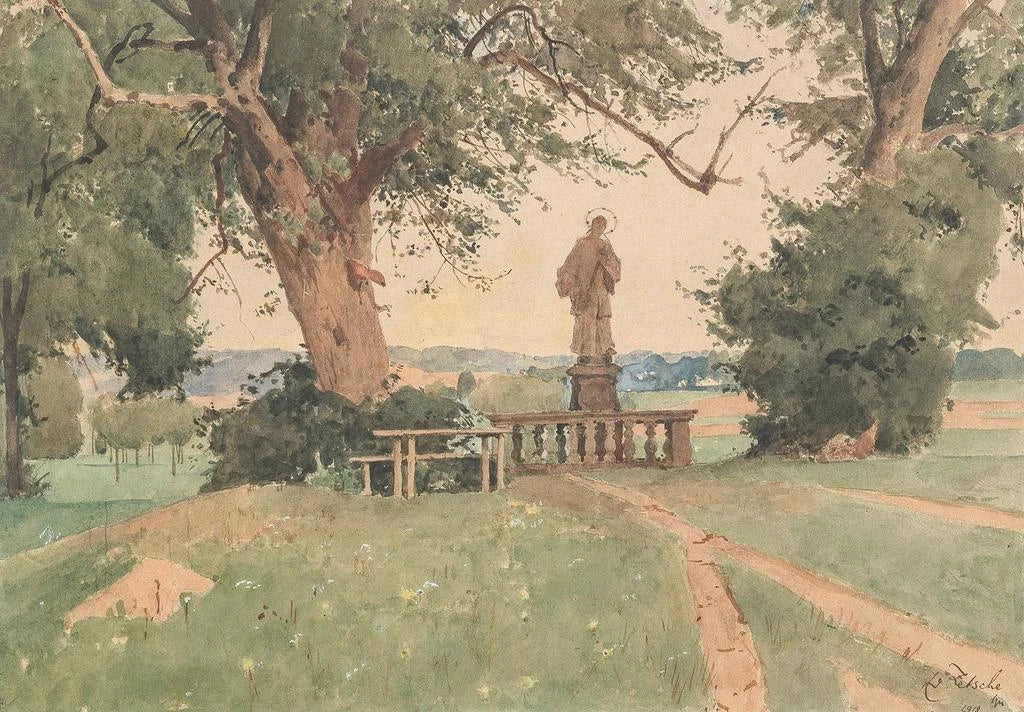 Eduard Zetsche, schilder uit de 19e eeuw, wordt erkend om zijn landschappen vol spiritualiteit en sereniteit. Geïnspireerd door de romantische beweging, probeert hij menselijke emoties uit te drukken door middel van de natuur. Zijn werken weerspiegelen een diepe verbinding met de natuurlijke wereld, vaak met religieuze elementen, zoals het standbeeld van Sint-Nepomucenus. Zetsche heeft de essentie van zijn tijd weten vast te leggen, waarin kunst een middel was tot ontsnapping en reflectie op de menselijke conditie. Zijn werk is een uitnodiging om de schoonheid van de wereld om ons heen opnieuw te ontdekken, terwijl hij de spirituele tradities eert.