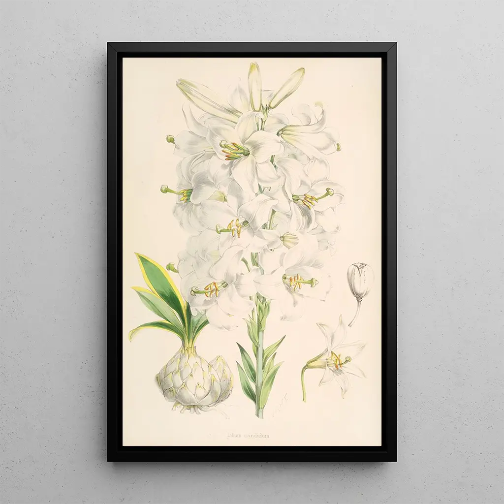 Lilium candidum, ook bekend als de witte lelie, onthult zich in een harmonieuze en elegante compositie. De glanzende witte bloemblaadjes openen zich gracieus, en roepen zuiverheid en sereniteit op. De aquareltechniek die door Walter Hood Fitch wordt gebruikt, maakt het mogelijk om het licht op subtiele wijze vast te leggen, waardoor delicate schaduwen ontstaan die diepte aan het kunstwerk toevoegen. De sfeer die uit deze kunstdruk voortkomt, is zowel rustgevend als inspirerend, en nodigt de kijker uit om onder te dompelen in een wereld van natuurlijke schoonheid.