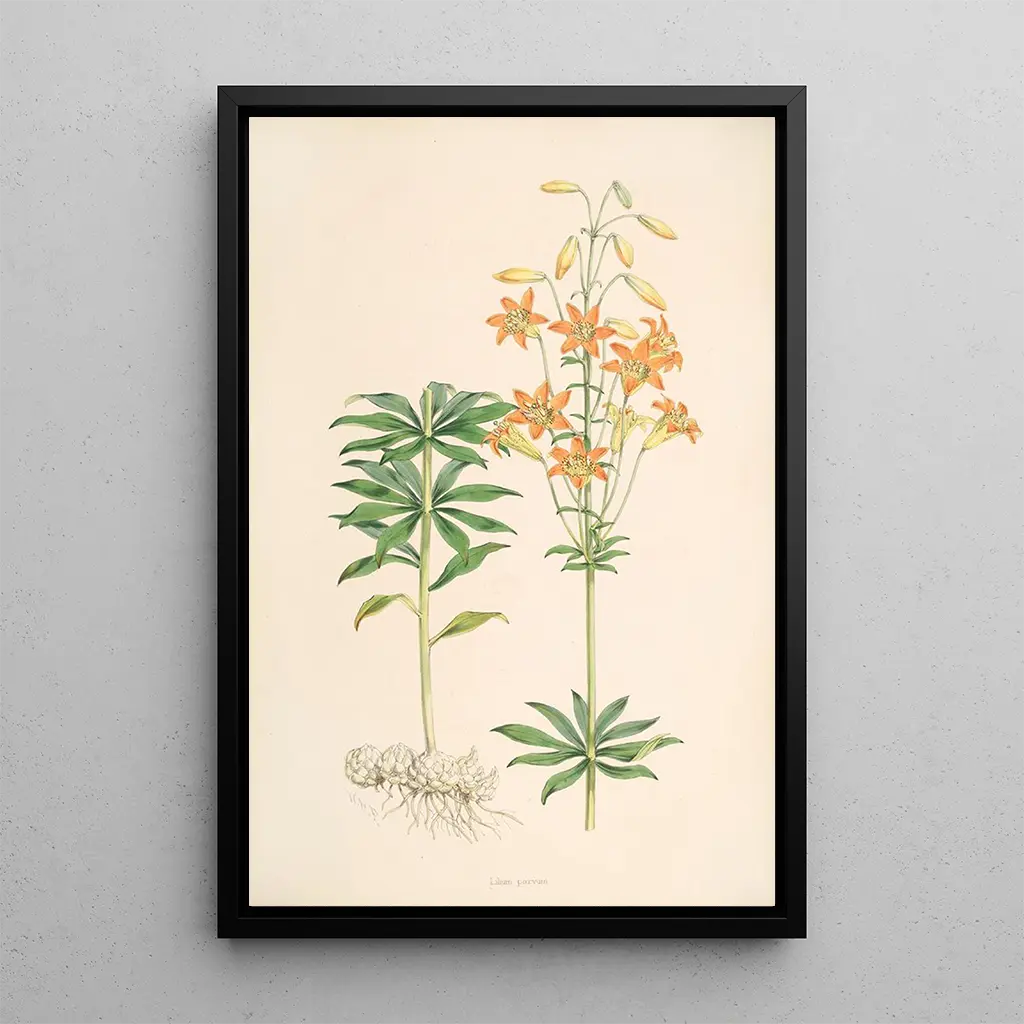 Lilium parvum : een verfijnde viering van de natuur Lilium parvum, een iconisch kunstdruk van Walter Hood Fitch, onderscheidt zich door zijn verfijnde compositie en levendige kleuren. Deze kunstdruk benadrukt tinten van groen en geel die de frisheid van de lentebloemweiden oproepen. De aquareltechniek, vakkundig toegepast, geeft het doek een luchtige lichtheid, terwijl de minutieuze details van de bloemblaadjes en bladeren de essentie van de bloem vastleggen. De sfeer die uit dit kunstwerk straalt, is zowel sereen als verkwikkend, en nodigt de kijker uit om onder te dompelen in een bloemrijk universum vol kleuren en emoties. Walter Hood Fitch : een pionier in botanische illustratie Walter Hood Fitch, botanist en illustrator uit de 19e eeuw, wordt erkend om zijn uitzonderlijke werk op het gebied van botanische kunstdruk. Opgeleid aan de kunstacademie, wist Fitch wetenschappelijke nauwkeurigheid te combineren met artistiek gevoel, wat hem in staat stelde werken van opmerkelijke precisie te creëren. Zijn stijl, beïnvloed door de tradities van de Engelse illustratie, markeerde zijn tijd en blijft kunstenaars van nu inspireren. Door samen te werken met gerenommeerde botanici, heeft hij bijgedragen aan de documentatie van vele soorten, waardoor hij een onmisbare figuur is in de geschiedenis van de botanische kunst. Een decoratief kunstdruk met vele voordelen De kunstdruk van Lilium parvum is een ideaal decoratief stuk om uw interieur te verfraaien, of het nu in een woonkamer, kantoor of slaapkamer is. De afdrukkwaliteit garandeert een nauwkeurige weergave van de kleuren en details van het originele kunstwerk, zodat u ten volle kunt genieten van de schoonheid van deze botanische illustratie. Met zijn onmiskenbare esthetische aantrekkingskracht brengt deze doek een vleugje natuur en elegantie in uw decoratie, terwijl hij de bewondering van bezoekers wekt. Gun uzelf deze kunstdruk en laat u meevoeren door de magie van bloemen.