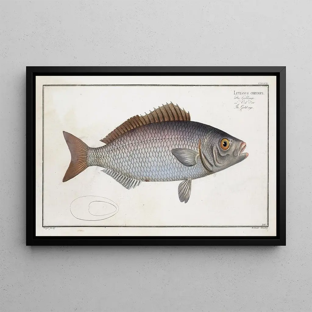 Marcus Elieser Bloch, natuurkundige en kunstenaar uit de achttiende eeuw, wordt erkend voor zijn bijdragen aan de ichthyologie, de wetenschap van vissen. Zijn werk, vaak gekenmerkt door oog voor detail en een wetenschappelijke aanpak, past binnen de stroming van het naturalisme. Geïnspireerd door de maritieme ontdekkingen van zijn tijd, wist Bloch kunst en wetenschap te combineren en eer te betonen aan de aquatische biodiversiteit. Zijn illustraties, waaronder de kunstdruk Lutjanus chrysops Le Goldeye, zijn niet alleen kunstwerken, maar ook waardevolle documenten voor het begrip van mariene soorten.