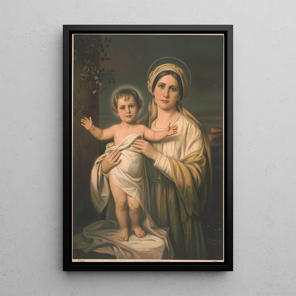 Vierge Marie tenant l'Enfant Jésus : une scène de tendresse sacrée La kunstdruk de la Vierge Marie tenant l'Enfant Jésus de Franz Doubek évoque une atmosphère empreinte de douceur et de sérénité. Dans cette œuvre, la palette de couleurs chaudes, dominée par des tons dorés et des nuances de bleu, crée une ambiance apaisante. La technique de l’artiste, qui mêle réalisme et éléments stylistiques baroques, permet de capturer l’intimité entre la mère et son enfant. Les détails délicats des visages et des drapés témoignent d'un savoir-faire exceptionnel, invitant le spectateur à une contemplation profonde de cette scène sacrée. Franz Doubek : un maître du réalisme religieux Franz Doubek, peintre tchèque du XIXe siècle, est reconnu pour ses œuvres religieuses qui allient tradition et innovation. Influencé par le mouvement romantique, il s'inscrit dans une période où l'art sacré connaît un renouveau. Sa capacité à transmettre des émotions à travers ses personnages le distingue de ses contemporains. Bien que moins connu que d'autres artistes de son époque, Doubek a su marquer son empreinte dans l'histoire de l'art grâce à ses représentations touchantes de la Vierge et des saints, témoignant d'une profonde spiritualité et d'une maîtrise technique. Une acquisition décorative aux multiples atouts La kunstdruk de la Vierge Marie tenant l'Enfant Jésus est une pièce décorative qui s'intègre parfaitement dans divers espaces tels que le salon, le bureau ou la chambre. Sa qualité d'impression et la fidélité aux détails de l'œuvre originale en font un choix idéal pour les amateurs d'art sacré. L'attrait esthétique de cette toile, avec ses couleurs apaisantes et son sujet universel, apporte une touche de sérénité et de spiritualité à votre intérieur. En choisissant cette kunstdruk, vous optez pour une œuvre qui enrichit votre décor tout en évoquant des valeurs de tendresse et de protection.