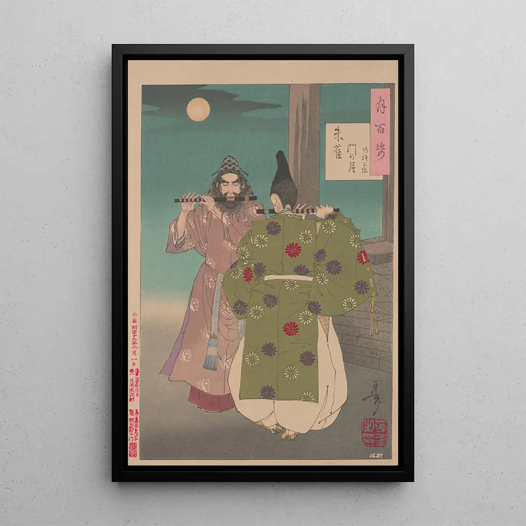 "Lune de la porte Suzaku" is een iconisch kunstdruk van Tsukioka Yoshitoshi, die de magie vastlegt van een door de maan verlichte nacht. De compositie toont een delicate scène waarin het zilveren licht weerspiegelt op natuurlijke elementen, waardoor een dromerige en serene sfeer ontstaat. De zachte kleuren en minutieuze details getuigen van de meesterschap van de kunstenaar in de kunst van de ukiyo-e kunstdruk. Dit kunstwerk roept niet alleen de schoonheid van de natuur op, maar ook een gevoel van innerlijke rust, en nodigt de kijker uit zich te verliezen in de contemplatie van deze nachtelijke scène.