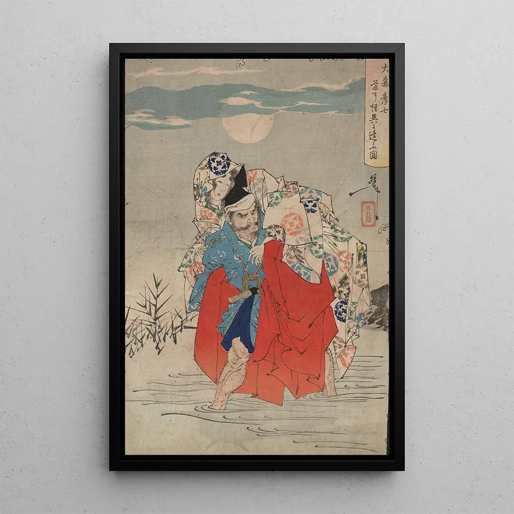 De kunstdruk van Tsukioka Yoshitoshi, getiteld "Omori Hikoshichi", dompelt ons onder in een wereld waar schaduwen en licht zich op een poëtische wijze verweven. Dit werk, emblematisch voor de Japanse ukiyo-e, onderscheidt zich door zijn levendige kleuren en minutieuze details. Yoshitoshi, meester in de ukiyo-e-techniek, gebruikt subtiele nuances om een sfeer te creëren die zowel mystiek als boeiend is. Het centrale personage, gekleed in traditionele kleding, lijkt uit een droom op te duiken, terwijl de achtergrond een landschap oproept dat zowel realistisch als fantastisch is. Dit doek nodigt uit tot contemplatie en onthult verborgen verhalen in elke penseelstreek.