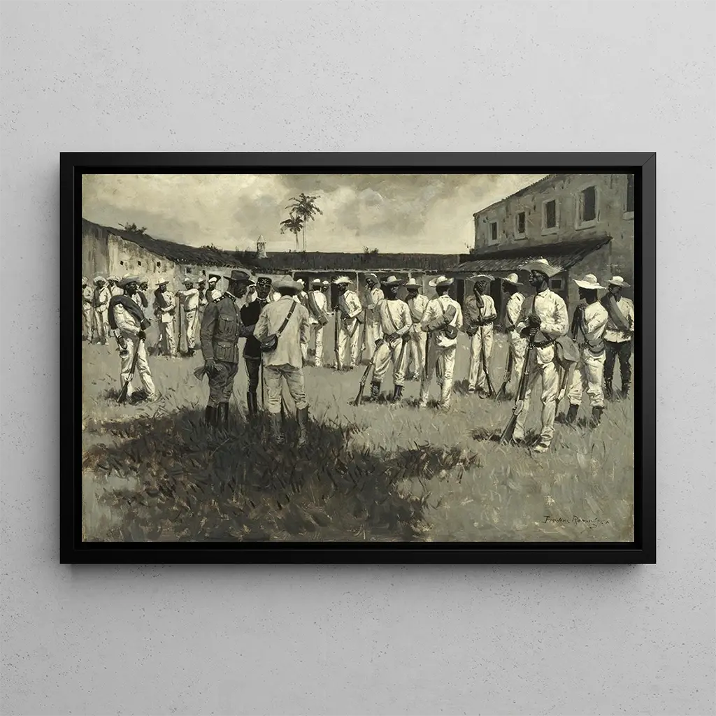 Ontbinding van het Gomez-leger: een moment van spanning en wanhoop De "Ontbinding van het Gomez-leger" van Frederic Remington is een kunstdruk die een dramatisch moment uit de Amerikaanse geschiedenis vastlegt. In dit schilderij roepen de donkere, aardse kleuren een gevoel van wanhoop op, terwijl de figuren van de soldaten, bevroren in vermoeidheid en berusting, getuigen van de harde realiteit van de oorlog. De techniek van Remington, die vakkundig realisme combineert met een vleugje expressionisme, brengt deze aangrijpende scène tot leven, waar de schaduw van de nederlaag over de personages hangt. Elk detail, van gezichtsuitdrukkingen tot de bewegingen van de paarden, is zorgvuldig weergegeven, wat een sfeer van voelbare spanning creëert. Frederic Remington: de chroniqueur van de Amerikaanse oorlogen Frederic Remington, actief aan het einde van de 19e eeuw, wordt erkend als een van de grootste illustratiekunstenaars van het Amerikaanse Westen. Zijn werken, vaak geïnspireerd door zijn eigen militaire ervaringen, schetsen het leven van soldaten en cowboys met een zeldzame authenticiteit. Remington wist de geest van zijn tijd vast te leggen, gekenmerkt door de expansie naar het Westen en de conflicten die daaruit voortvloeiden. Zijn stijl, die dynamiek en precisie combineert, heeft vele kunstenaars beïnvloed en wordt nog steeds gevierd vanwege zijn vermogen verhalen te vertellen via kunst. Een decoratief stuk met vele voordelen De kunstdruk van de "Ontbinding van het Gomez-leger" is een krachtig decoratief stuk voor wie een vleugje geschiedenis en diepgang aan hun interieur willen toevoegen. Of het nu in een kantoor, woonkamer of tentoonstellingsruimte is, dit doek trekt de aandacht en zet tot nadenken. De afdrukkwaliteit garandeert een goede weergave van de kleuren en details van het originele werk, waardoor dit stuk een waardevolle aanvulling is op elke collectie. Met zijn esthetische aantrekkingskracht en aangrijpende boodschap zal deze kunstdruk liefhebbers van kunst boeien en de sfeer in elke ruimte verrijken.