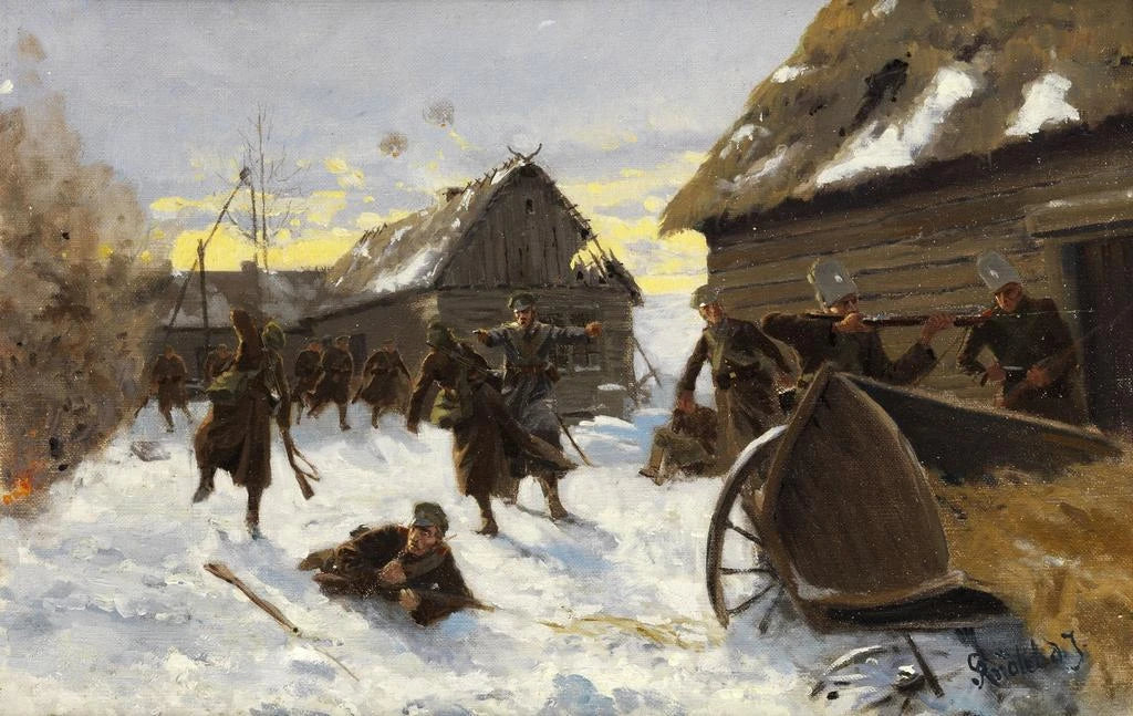 Oorloggevecht in een besneeuwd dorp - Richard Knötel