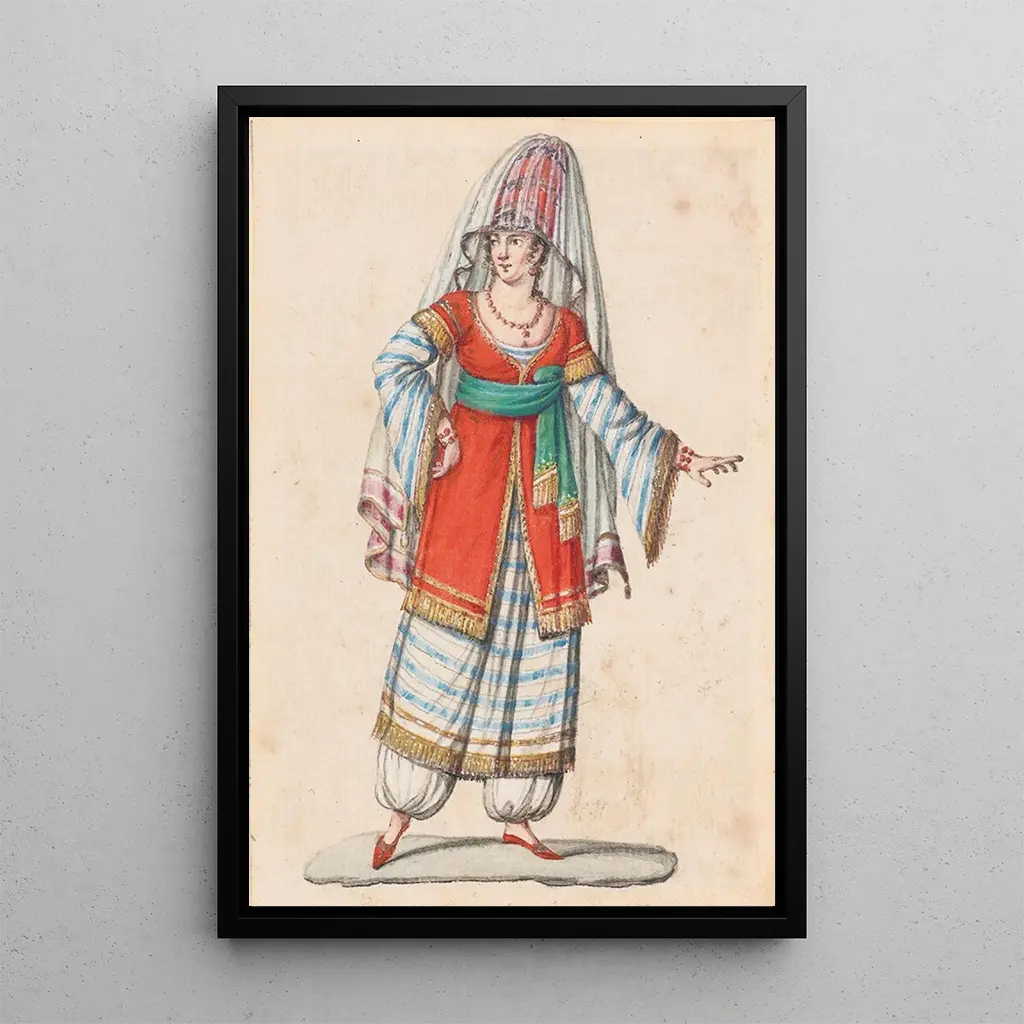 De kunstdruk van Costumes orientaux 4 brengt de kijker in een levendige en gedetailleerde wereld. De fonkelende nuances van rood, goud en blauw mengen harmonieus, waardoor een feestelijke en mysterieuze sfeer ontstaat. Elke stof lijkt tot leven te komen, met complexe patronen die verhalen vertellen over verre culturen. De gebruikte techniek, waarschijnlijk een mengeling van olieverf en gemengde technieken, geeft het kunstwerk diepte en textuur die het oog boeien. Dit schilderij nodigt uit om de kledingtradities en interculturele invloeden te verkennen die de geschiedenis hebben gevormd.
