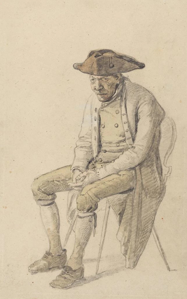 Vieux paysan assis avec tricorne : un portrait empreint de sagesse