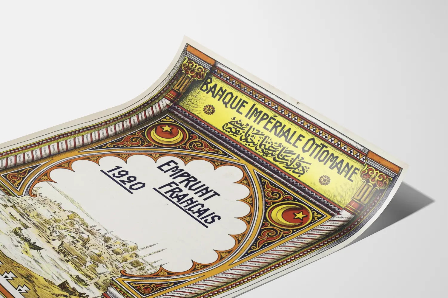 Deze oude affiche van de Ottomaanse Keizerlijke Bank uit 1920 vormt een rijke wanddecoratie vol geschiedenis en artistieke details. Ze benadrukt de « Franse lening » in een grafische stijl die typisch is voor het begin van de twintigste eeuw, met een versierde compositie die doet denken aan oosterse esthetiek. Deze affiche wordt gekenmerkt door een fijn versierde rand, geïnspireerd op Ottomaanse architectonische motieven, die een historisch zeegezicht omlijst met schepen en iconische bouwwerken, evocaties van Constantinopel in die tijd. De inscripties in het Frans en Arabisch onderstrepen een belangrijke multiculturele en institutionele dimensie, terwijl de namen van grote Europese en mediterrane steden zoals Parijs, Londen, Marseille, Manchester en natuurlijk Constantinopel onderaan staan, symboliserend de internationale handels- en financiële banden. Dit stuk toont een perfecte harmonie tussen kunst en geschiedenis, ideaal als wanddecoratie in een vintage stijl of voor liefhebbers van economische en artistieke geschiedenis. Gebruikt als poster of ingelijst schilderij, brengt het een authentieke en verfijnde toets in elk interieur, of dat nu modern of klassiek is. Het verticale formaat en de rijke kleuren in geel, rood en zwart maken het tot een opvallend decoratief element dat de aandacht trekt en karakter toevoegt aan een muur. Een unieke vintage affiche die een visuele en culturele reis biedt door de economische uitwisselingen van het begin van de twintigste eeuw.