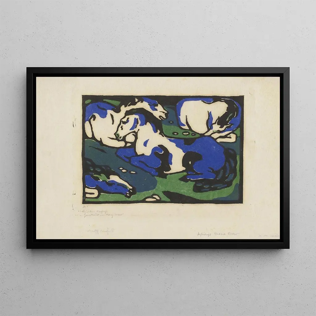 Chevaux au Repos : een ode aan de schoonheid van de dieren "Chevaux au Repos", een iconisch werk van Franz Marc, vangt de essentie van de harmonie tussen dier en natuur. De paarden, afgebeeld in levendige tinten blauw, geel en rood, lijken te bloeien in een dromerig landschap. Marc's techniek, gekenmerkt door gestileerde vormen en gedurfde kleuren, creëert een sfeer die zowel dynamisch als sereen is. Dit doek roept een moment van rust op, waarin de paarden, symbolen van kracht en vrijheid, vredig rusten en de kijker een rustgevende en contemplatieve blik bieden. Franz Marc : pionier van het fauvisme en het expressionisme Franz Marc, een belangrijke figuur van het begin van de 20e eeuw, is een van de oprichters van de expressionistische beweging in Duitsland. Geïnspireerd door het fauvisme en de spirituele filosofieën van zijn tijd, ontwikkelt hij een unieke stijl die kleur en vorm benadrukt om diepe emoties uit te drukken. Zijn passie voor dieren, die hij beschouwt als symbolen van zuiverheid, weerspiegelt zich in zijn werken. "Chevaux au Repos" is een getuigenis van zijn inzet voor de weergave van de natuur en dieren, terwijl het zijn verlangen toont om de realiteit te overstijgen door kunst. Een decoratieve aankoop met vele voordelen De kunstdruk van "Chevaux au Repos" is een ideale keuze voor wie een artistiek accent aan hun interieur wil toevoegen. Of het nu in een woonkamer, kantoor of slaapkamer is, dit schilderij trekt de aandacht en wekt bewondering. De kwaliteit van de kunstdruk garandeert een trouwheid aan de heldere kleuren en de dynamische vormen van het originele werk, waardoor je leefruimte wordt verrijkt. Met zijn esthetische aantrekkingskracht en symbolische diepgang wordt dit doek een echt gespreksonderwerp, dat je decoratie transformeert in een viering van de schoonheid van de dieren en kunst.