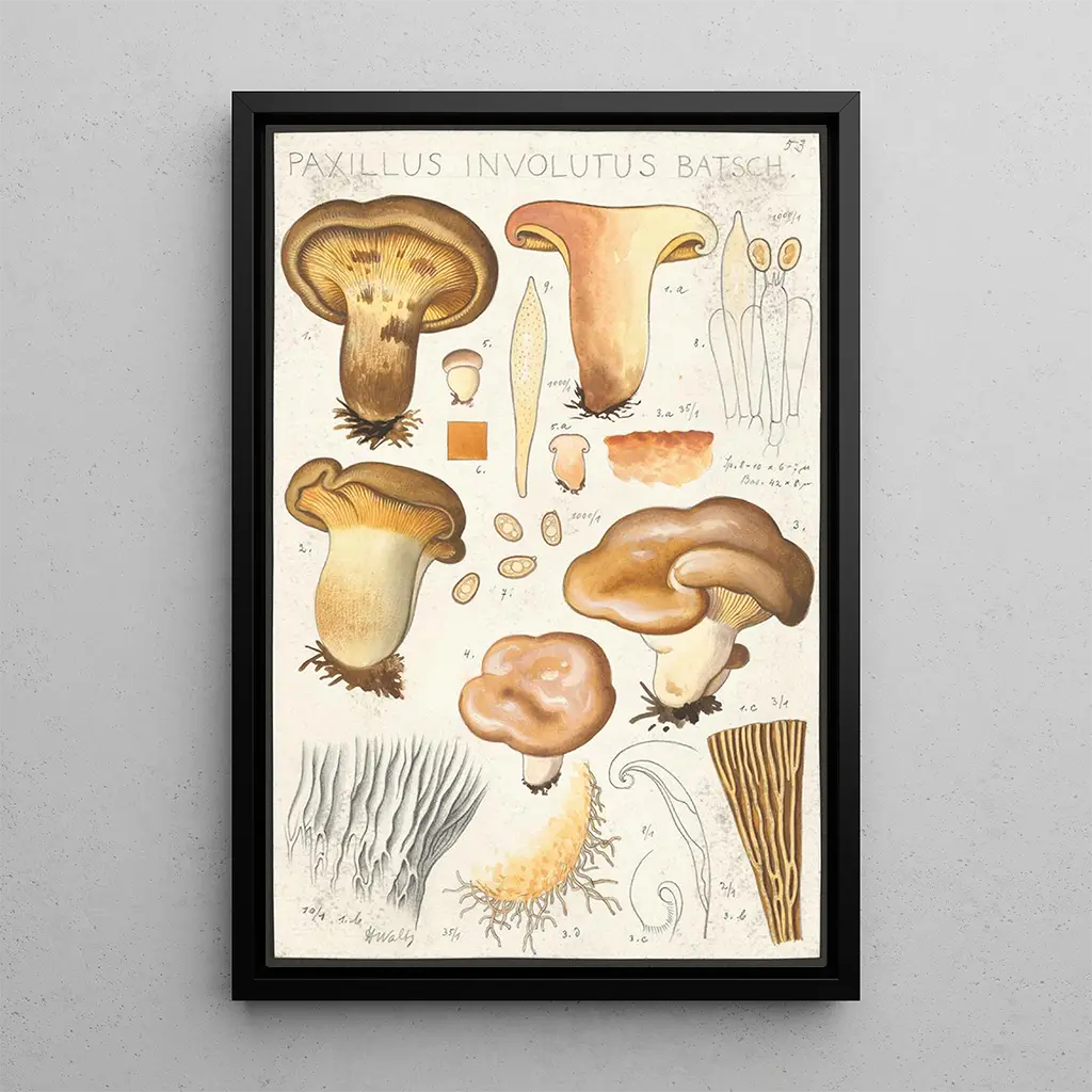 In dit fascinerende kunstdruk dompelt Hans Baldung ons onder in het raadselachtige universum van paddenstoelen, waarbij hij de organische schoonheid van Paxillus involutus vastlegt. De aardse kleuren en de nuances van groen roepen een sfeer op die zowel mysterieus als rustgevend is. De techniek van Baldung, die realisme en stylisering combineert, brengt deze voorstelling tot leven, waarbij elk detail van de paddenstoel lijkt te vibreren onder het licht. Het kunstdruk nodigt uit tot een aandachtige contemplatie, waarbij de subtiliteiten van de natuur en de complexiteit van haar vormen worden onthuld. Dit schilderij, een ware ode aan de biodiversiteit, herinnert ons aan de rijkdom van de wereld om ons heen.
