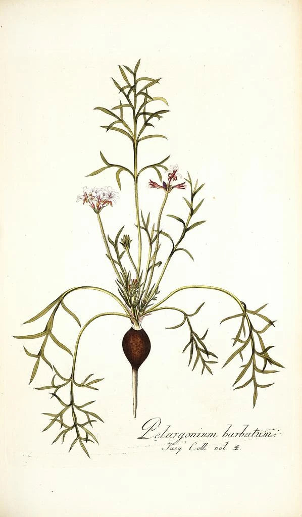 Nikolaus Joseph Freiherr von Jacquin, botanist en kunstenaar uit de achttiende eeuw, speelde een cruciale rol in de wetenschappelijke illustratie van planten. Opgeleid aan de Universiteit van Wenen, werd hij beïnvloed door de stromingen van het naturalisme en de rococo, en integreerde esthetische elementen in zijn botanische studies. Zijn werken, waaronder Pelargonium barbatum, weerspiegelen een tijd waarin wetenschap en kunst samenkwamen om de biodiversiteit te verkennen. Jacquin reisde naar kolonies en bracht exotische specimens mee die de botanische kennis van zijn tijd verrijkten. Zijn nalatenschap blijft voortleven, en inspireert kunstenaars en wetenschappers door de eeuwen heen.