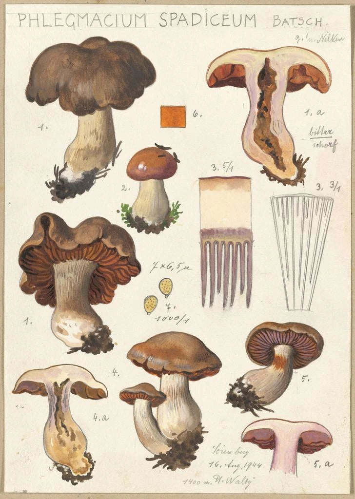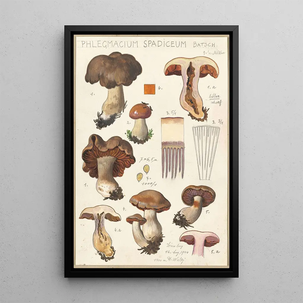 De kunstdruk van Phlegmacium spadiceum Batsch onthult een fascinerende wereld van paddenstoelen met diverse vormen en aardse kleuren. Dit werk van Hans Baldung onderscheidt zich door zijn realistische en gedetailleerde weergave van de specimens, die een inkijkje geven in de rijkdom van de biodiversiteit. De bruine en okerkleuren, gecombineerd met een minutieuze schildertechniek, creëren een warme en organische sfeer. Elke paddenstoel lijkt tot leven te komen en nodigt de kijker uit om de mysteries van de natuur te verkennen en haar verborgen schoonheid te waarderen.