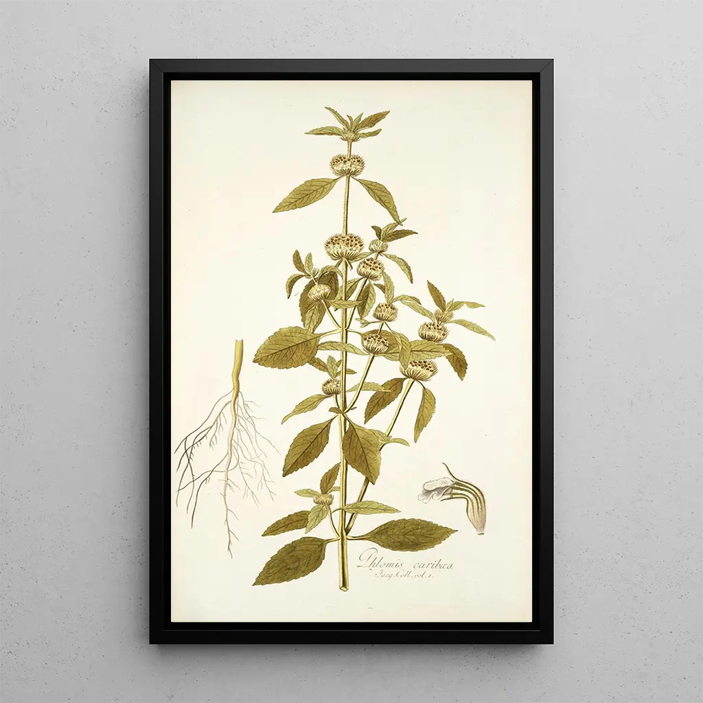 De kunstdruk van Phlomis caribaea, een werk van Nikolaus Joseph Freiherr von Jacquin, dompelt ons onder in een fascinerend botanisch universum. Met levendige kleuren en minutieuze details roept dit doek de rijkdom van de tropische flora op. De nuances van groen en geel vermengen zich harmonieus, waardoor een levendige en rustgevende sfeer ontstaat. De aquareltechniek, vakkundig toegepast, maakt het mogelijk de lichtheid van de bladeren en de delicatesse van de bloemen vast te leggen. Elk element lijkt te ademen, en nodigt de kijker uit tot een aandachtige contemplatie van de wonderen van de natuur.