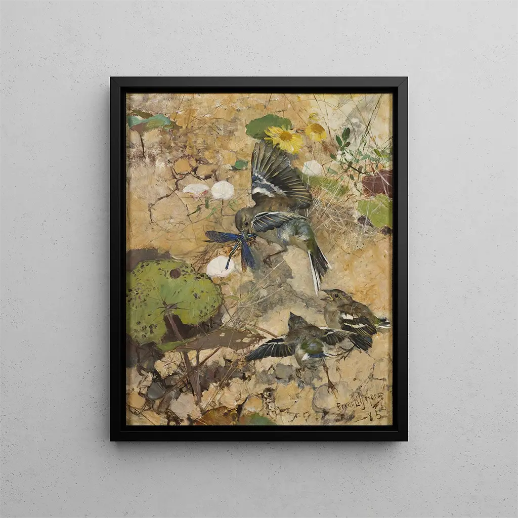 Bruno Liljefors, onbetwiste meester van de dierenkunst, slaagt erin niet alleen de verschijning van levende wezens vast te leggen, maar ook hun essentie. In "Pinsons des arbres et libellules" gebruikt hij levendige kleuren en subtiele lichtspelingen om een sfeer te creëren die zowel rustgevend als dynamisch is. De tinten groen en blauw mengen harmonieus, wat de frisheid van een lentemorgen oproept. De minutieuze details van de veren van de vogels en de vleugels van de libellen getuigen van een nauwkeurige observatie en een beheersde techniek. Elk element van de compositie is zorgvuldig samengesteld, waardoor het oog door het schilderij kan dwalen en de rijkdom ervan kan waarderen. Deze unieke stijl, zowel realistisch als poëtisch, maakt van dit werk een meesterwerk dat ongetwijfeld de bewondering van kunstliefhebbers zal wekken.