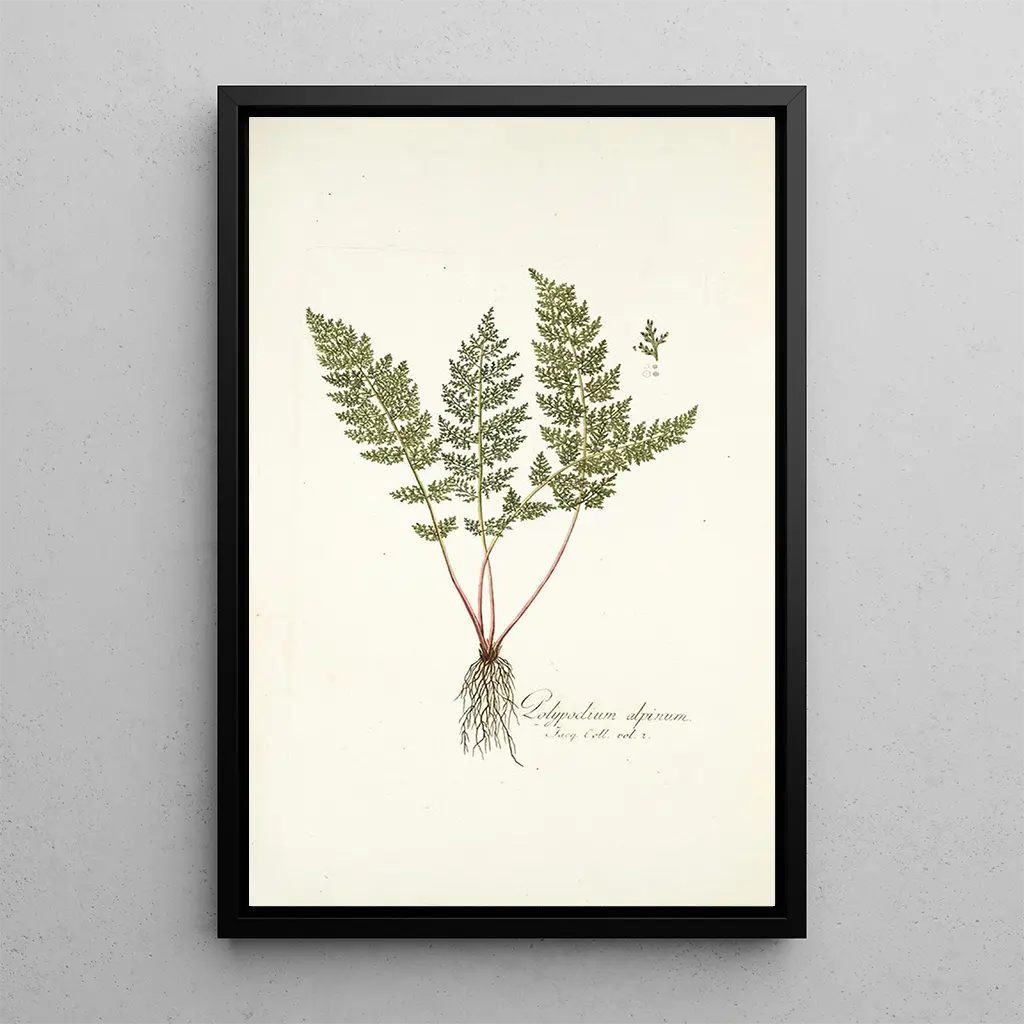 De kunstdruk van Polypodium alpinum dompelt ons onder in de delicate wereld van varens. Met zijn fijn gesneden bladeren en levendige groene tint, roept dit kunstwerk de frisheid van de bergen op. De techniek van de kunstenaar, die aquarel en tekening combineert, creëert een lichte en luchtige sfeer, alsof elk blad meewaait met de wind. De nuances van groen, variërend van licht tot donker, geven diepte aan deze botanische voorstelling en nodigen de kijker uit om de minutieuze details van de plant te verkennen.