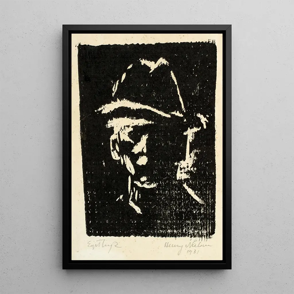 Het "Portret van een man met hoed" van Henry Nielsen onderscheidt zich door zijn verfijning en mysterieuze uitstraling. Het kleurenpalet, gedomineerd door donkere en diepe tinten, geeft het werk een sfeer die zowel plechtig als boeiend is. De beheersing van het licht door Nielsen benadrukt de details van het gezicht en de hoed, waardoor een opvallend contrast ontstaat dat de aandacht trekt. Dit schilderij, zowel klassiek als tijdloos, nodigt de kijker uit om na te denken over de identiteit van deze man, terwijl het de elegantie van de mode van zijn tijd viert.