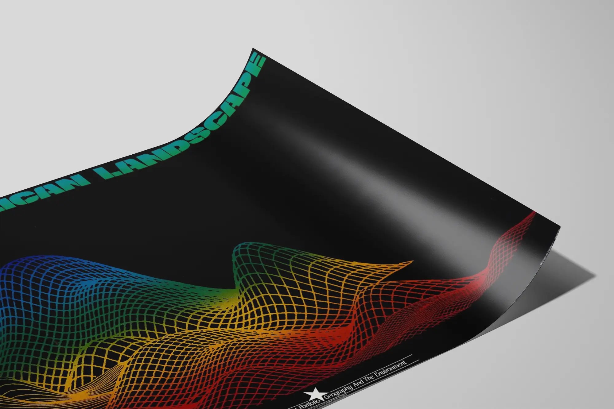 Deze poster onderscheidt zich door zijn minimalistische en geometrische ontwerp dat zowel technologie als natuur oproept, en zo een harmonieuze balans creëert tussen abstractie en representatie. De zwarte achtergrond versterkt de helderheid van de kleuren en benadrukt de rasterstructuur, waardoor diepte en volume aan het geheel worden toegevoegd. Bovenaan benadrukt de tekst "THE AMERICAN LANDSCAPE" in hoofdletters en vetgedrukte stijl het grafische karakter en vormt het een krachtig typografisch element dat de compositie voltooit.