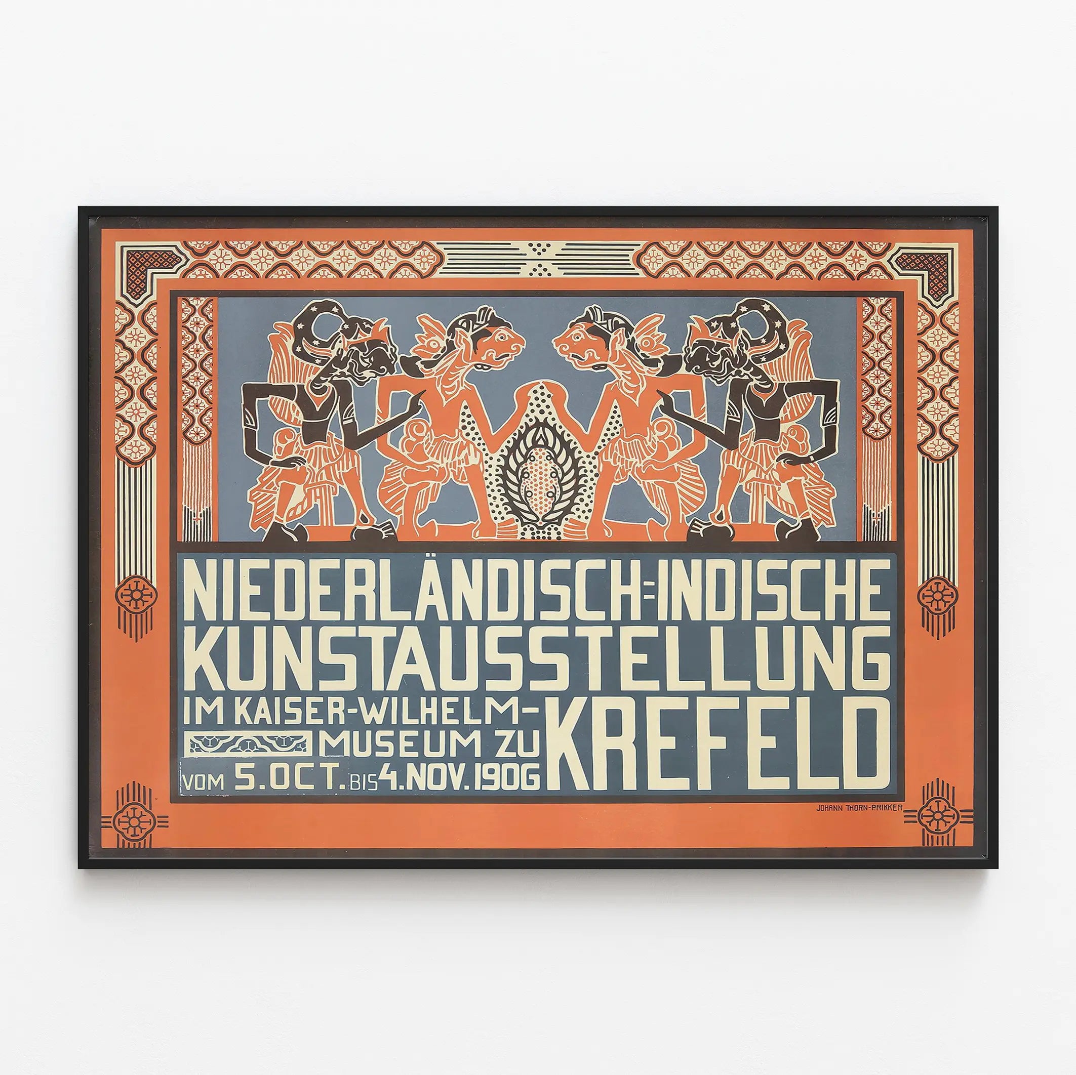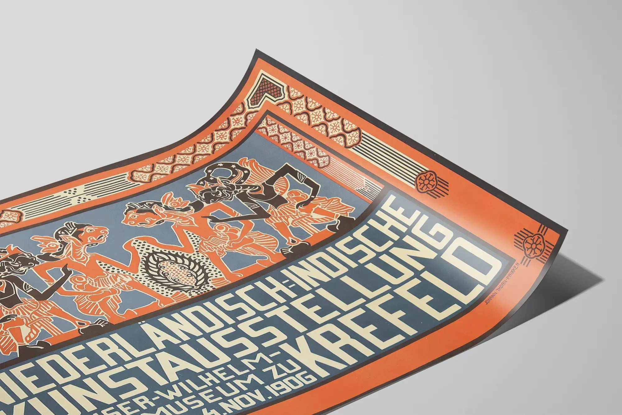 Deze vintage poster is een opvallend stuk muurdecoratie, ideaal voor kunst- en geschiedenisliefhebbers. Ze kondigt de tentoonstelling van Nederlands-Indonesische kunst aan die plaatsvond in het Kaiser-Wilhelm-Museum in Krefeld, van 5 oktober tot 4 november 1906. Deze affiche is kenmerkend voor de Art Deco-stijl, met geometrische vormen en gestileerde motieven, evenals een kleurenpalet dat wordt gedomineerd door oranje, zwart en blauw-grijs.