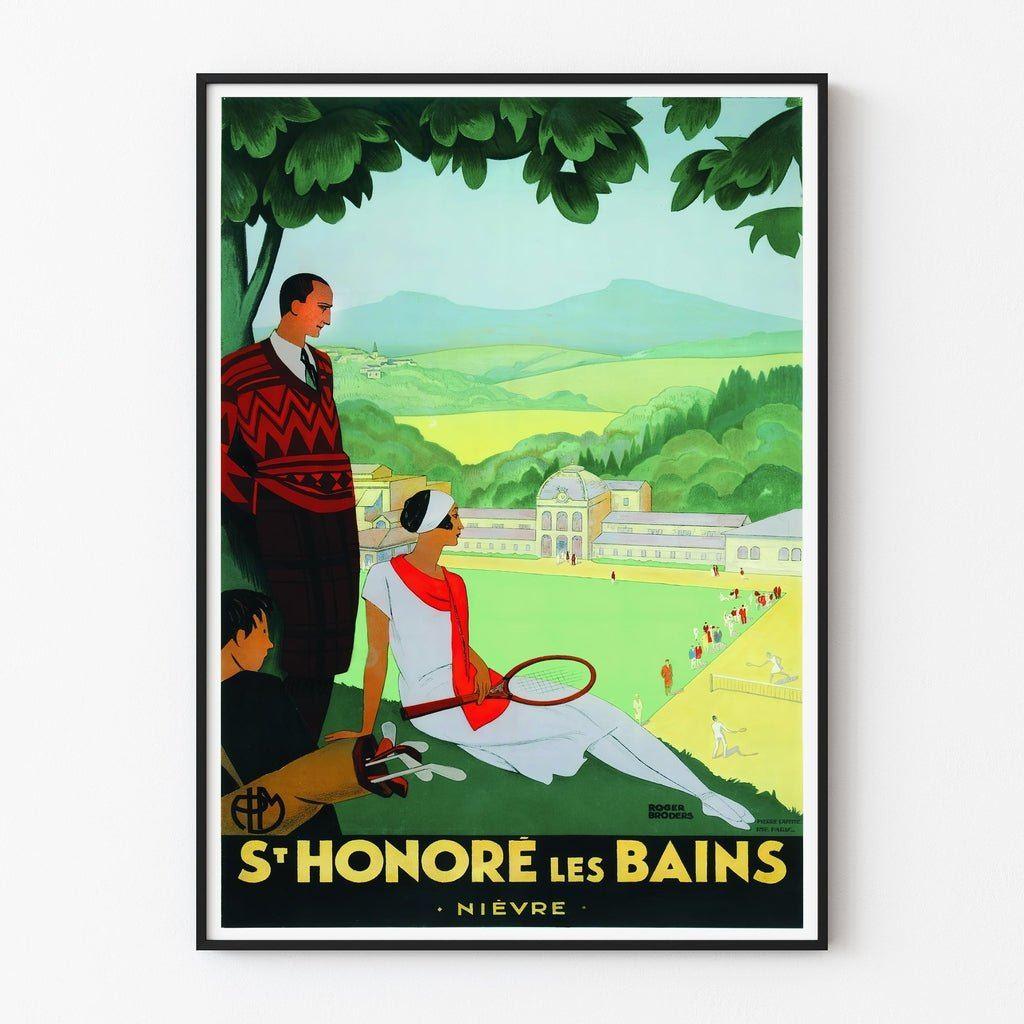 St-Honoré-les-Bains staat bekend om zijn rustgevende thermale bronnen en serene sfeer, die al eeuwen bezoekers aantrekken voor rust en verzorging. Dit poster illustreert een ontspanningsmoment in de prachtige tuinen, waar elegante figuren rusten na een potje tennis. De zachte kleuren en strakke lijnen, typerend voor Broders, voegen een vleugje nostalgie en verfijning toe.