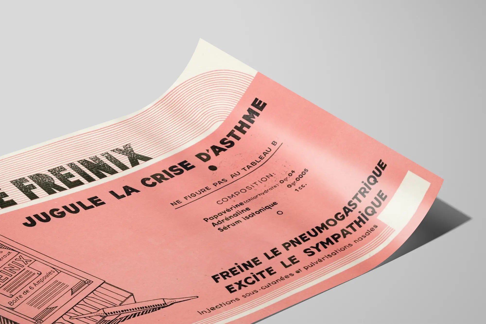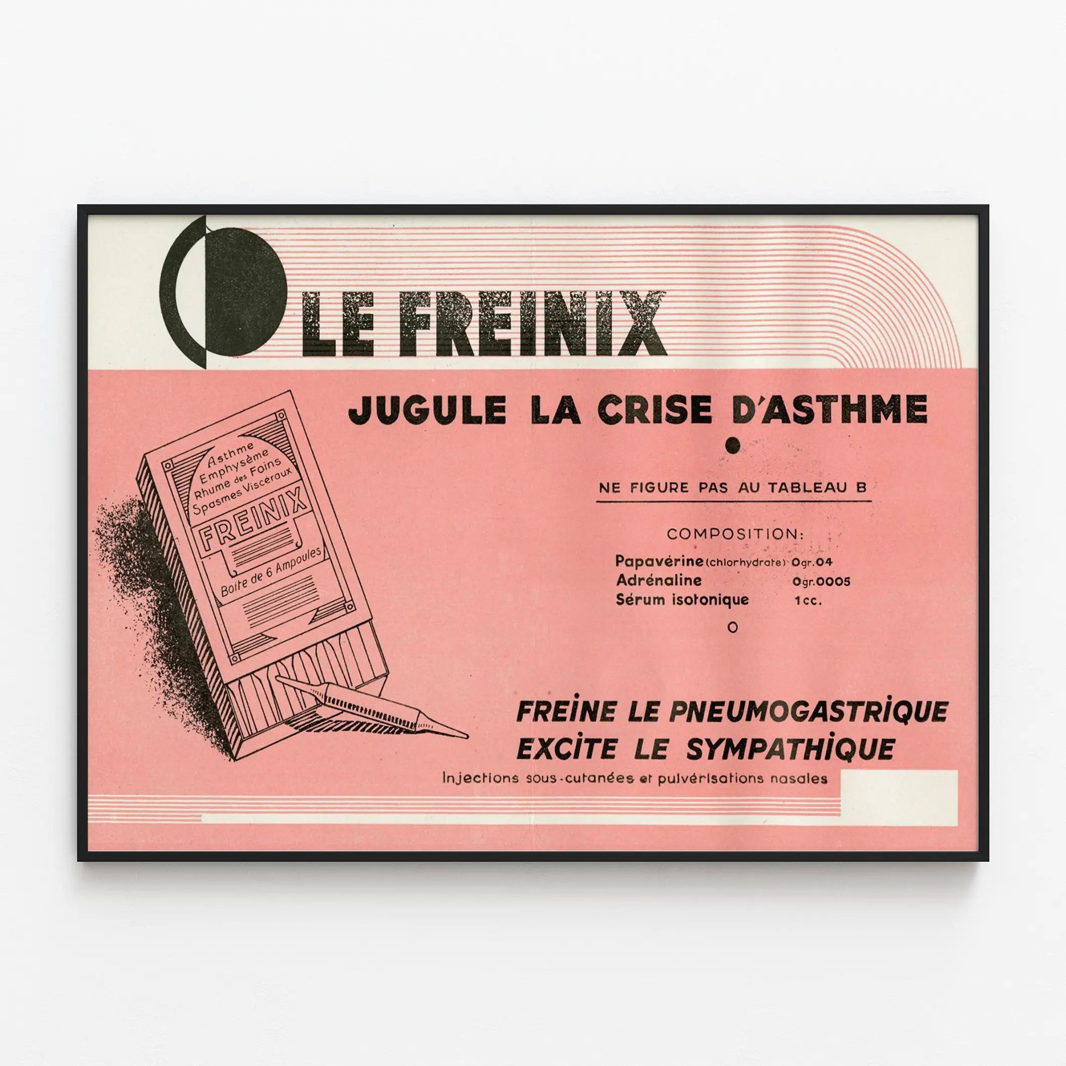 Deze vintage poster toont Le Freinix, een product ontwikkeld om astma-aanvallen en andere ademhalingsproblemen zoals longemfyseem, hooikoorts en buikkrampen te bestrijden. De aangegeven samenstelling bevat papaverine (chloride), adrenaline en isotone oplossing, en beschrijft een medicinale oplossing toegediend via onderhuidse injecties en neussprays. De opmaak speelt met pastelkleuren, met een roze achtergrond en grafische elementen in zwart, inclusief een tekening van een doos met zes ampullen van Freinix, wat een retrostijl benadrukt die doet denken aan farmaceutische advertenties uit het midden van de twintigste eeuw.