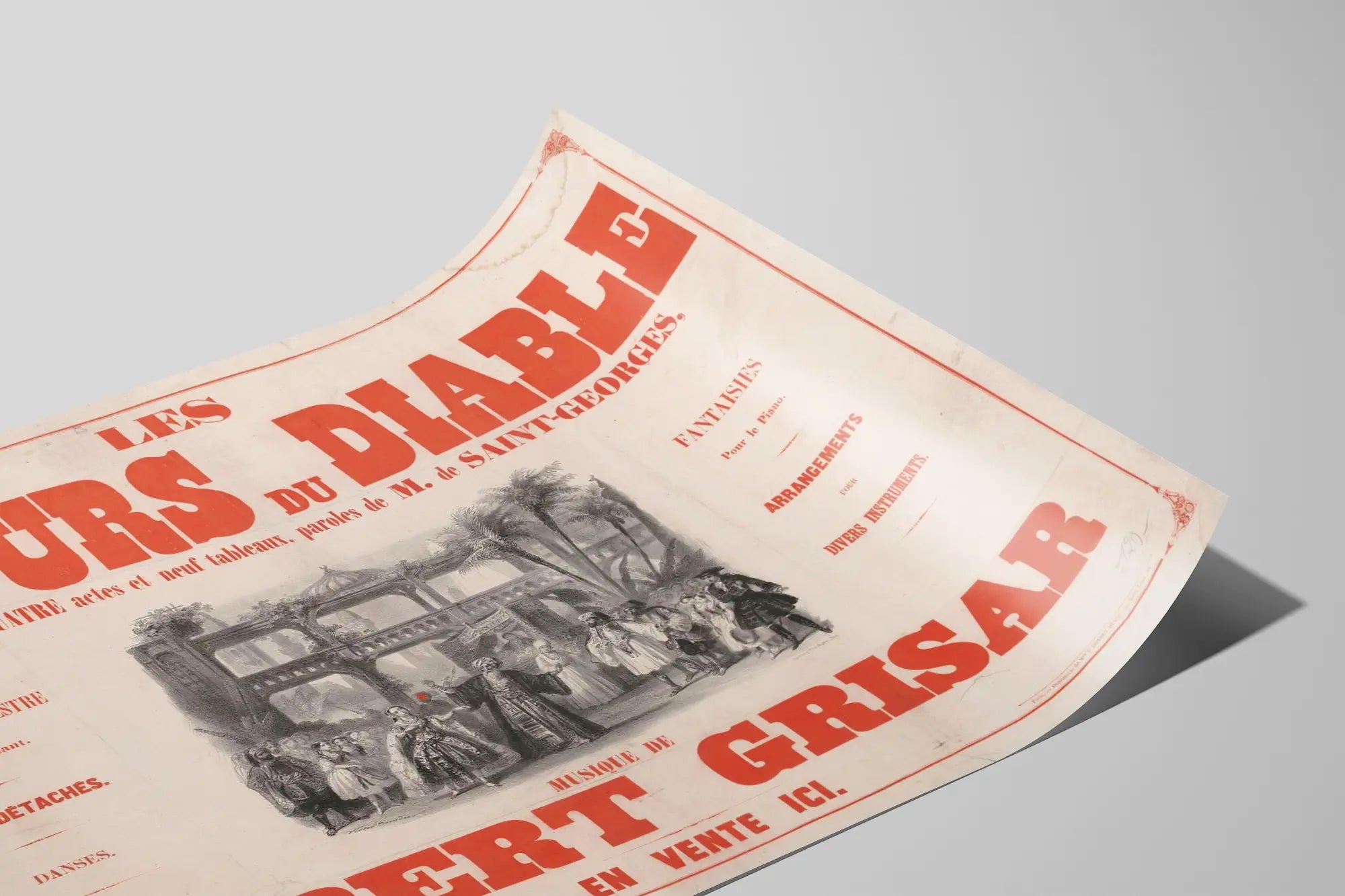 Ontdek dit iconische vintageposter getiteld « De Liefdes van de Duivel », een echt wanddecoratiestuk dat de wereld van de operette oproept. Deze affiche toont een partiturorchestraal voor piano en zang, met losse aria’s en dansen, die de muzikale rijkdom van dit vierdelige werk met negen tafereelen weerspiegelt. De dominante rode typografie geeft een opvallende retrostijl, terwijl de centrale gravure een toneelscène afbeeldt met kostuumdragende personages uit een exotisch decor. Deze oude affiche vindt haar esthetische waarde in haar evenwichtige compositie tussen tekst en beeld, ideaal voor liefhebbers van klassieke muziek, theaterfans of interieurontwerpers die een vleugje culturele geschiedenis willen integreren. De fijnzinnige details van de tekening, die een oude architectuur toont omringd door weelderige palmbomen, maken het geheel compleet en zorgen voor een boeiend visueel effect om een muur op een originele wijze te decoreren. Deze verzamelposter is ook een eerbetoon aan Albert Grisar, de componist van de muziek, wiens naam onderaan de afbeelding wordt benadrukt. Geschikt voor alle soorten ruimtes, kan deze wanddecoratie zowel in een vintage woonkamer, een muziekbibliotheek als in een creatief kantoor worden geplaatst. Gun jezelf deze affiche die subtiel grafische kunst en muzikaal erfgoed combineert, voor een unieke en verfijnde sfeer. Perfect om een witte muur of een neutrale ondergrond te verfraaien, wordt het een boeiend middelpunt dat de aandacht trekt van alle bezoekers. Kortom, deze affiche De Liefdes van de Duivel is een bijzondere en karaktervolle decoratieve oplossing voor wie passie voor muziek en artistieke esthetiek in hun interieur wil verenigen.