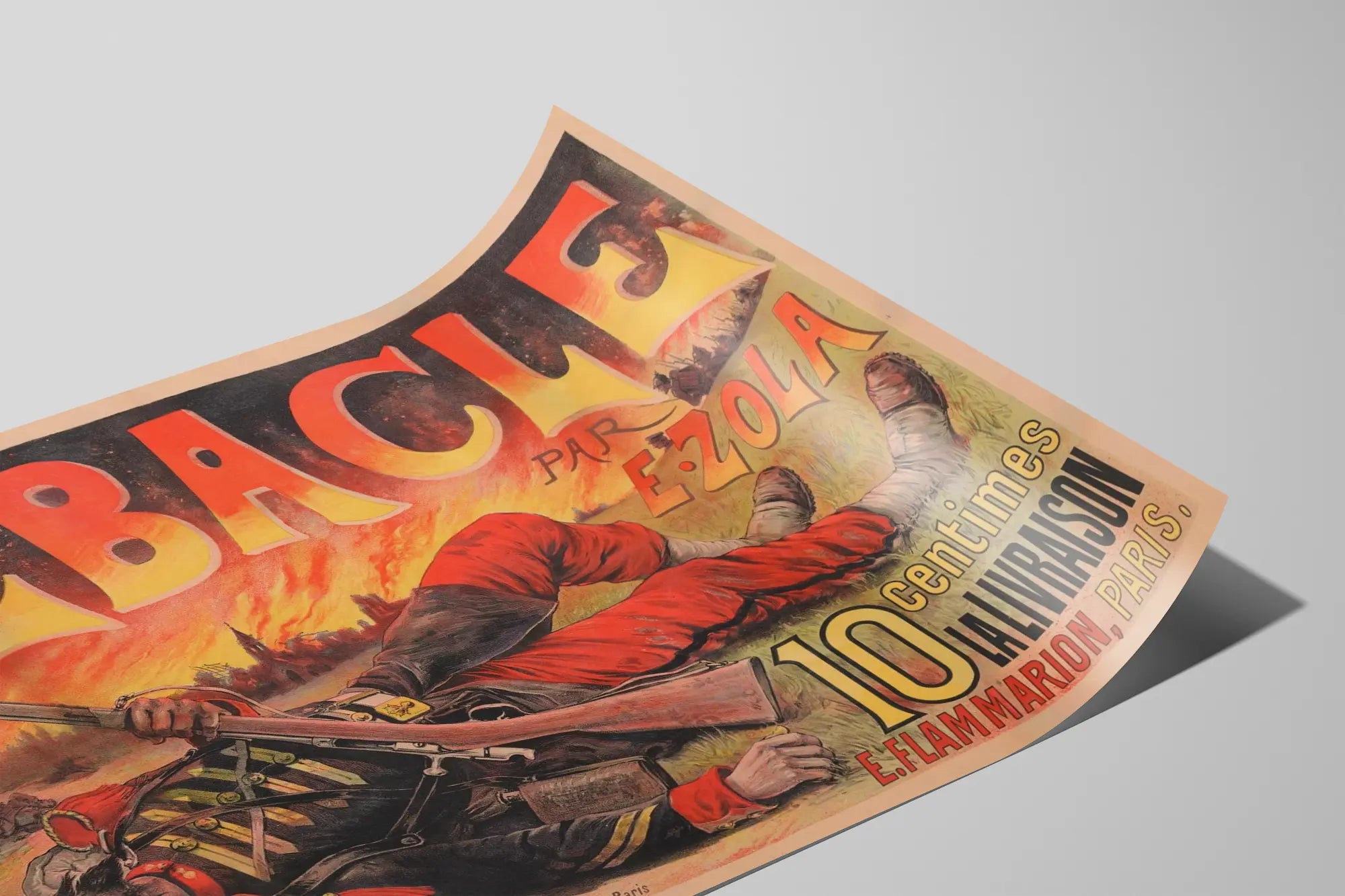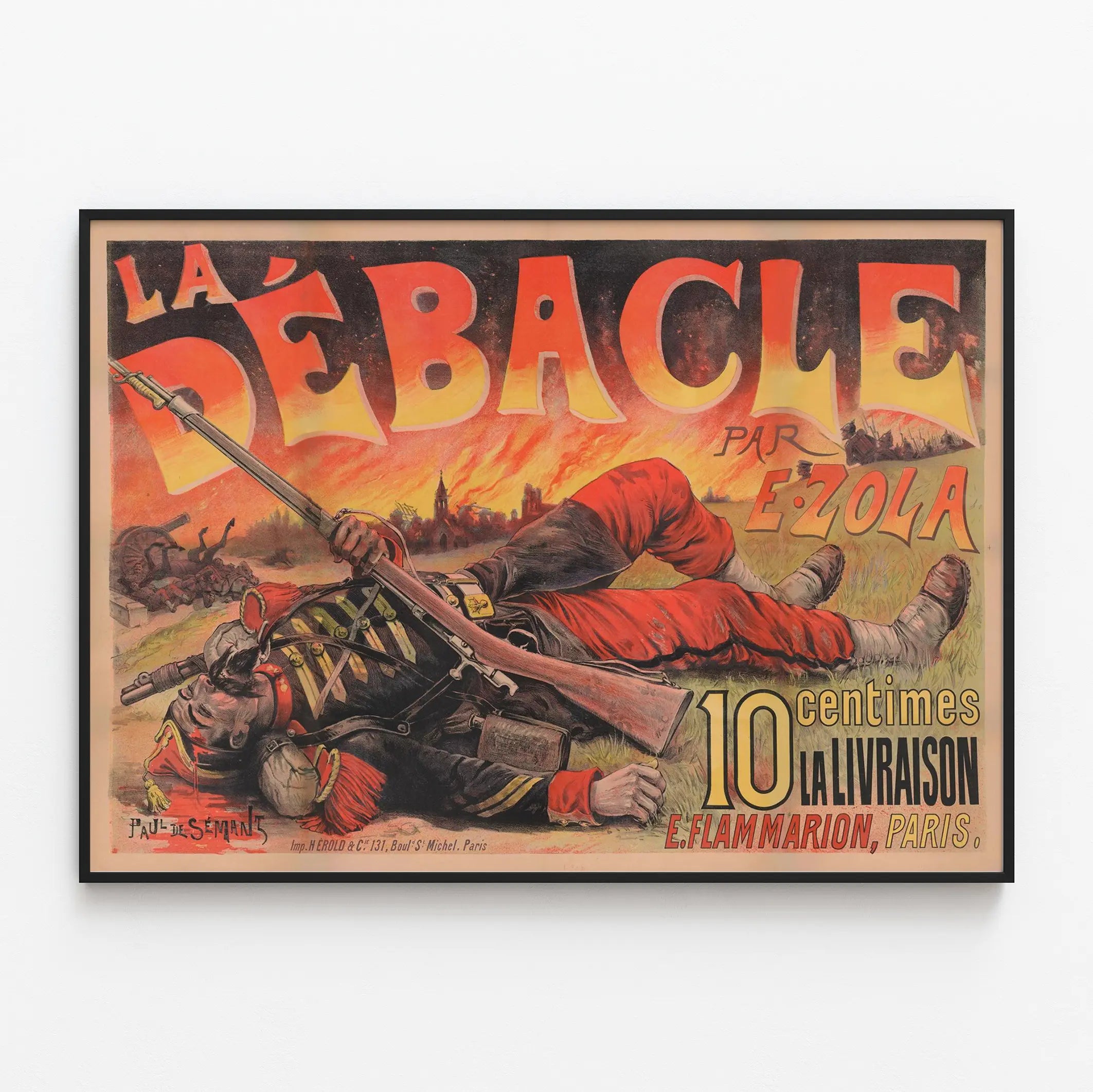 Deze vintage poster, geïllustreerd door Paul de Sémantis, biedt een indrukwekkende weergave van de historische roman "La Débâcle" van Émile Zola. Ontworpen in een klassieke en dramatische stijl, toont dit muurstuk een soldaat die op de grond ligt, gekleed in een gedetailleerd militair uniform met een geweer in de hand, en roept de geweldadigheid en wanhoop van oorlog op. De brandende achtergrond symboliseert de vernietiging en versterkt de dramatische intensiteit van de afbeelding. Deze poster is een uitstekende keuze voor liefhebbers van literatuur en geschiedenis die hun interieur willen verrijken met een kunstzinnige en evocatieve decoratie. Perfect als poster of muurdecoratie, past hij gemakkelijk in een woonkamer, kantoor of bibliotheek, en voegt een vleugje vintage elegantie en een interessant gesprekspunt toe. De grote, kleurrijke typografie van de titel "LA DÉBÂCLE" trekt onmiddellijk de aandacht, terwijl alle grafische elementen de historische en literaire context van de negentiende eeuw weerspiegelen. Dit werk, gedrukt in Frankrijk door H. Érold & Cie, met de vermelding van uitgave E. Flammarion Parijs, bevestigt de authenticiteit en de directe band met de Franse uitgeverswereld. De artistieke stijl, gecombineerd met de sterke visuele impact, maakt van deze poster een opvallende keuze voor een originele muurdecoratie die kunst, geschiedenis en literatuur combineert.