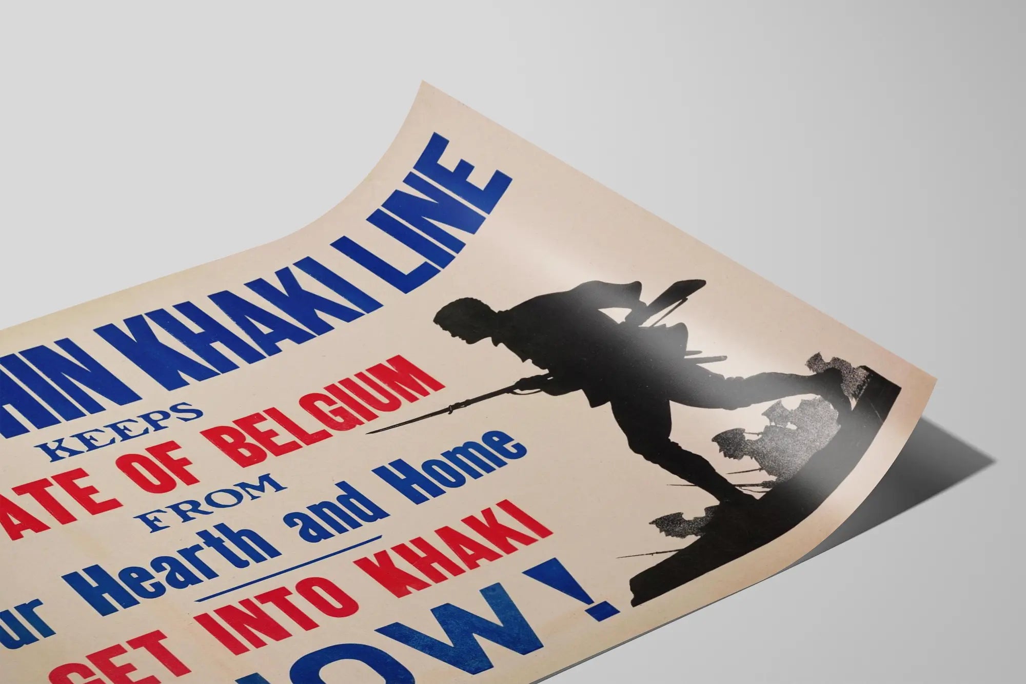 De poster "The Thin Khaki Line" herinnert aan het belang van betrokkenheid en plicht door middel van een iconisch ontwerp. Ze kan ook dienen als educatieve poster of als centraal stuk op een muur vol herinneringen. Haar krachtige boodschap en de dynamische silhouet van de soldaat creëren een sterk visueel effect dat deze poster een onmisbaar element maakt in een vintage- of militaire wereld.