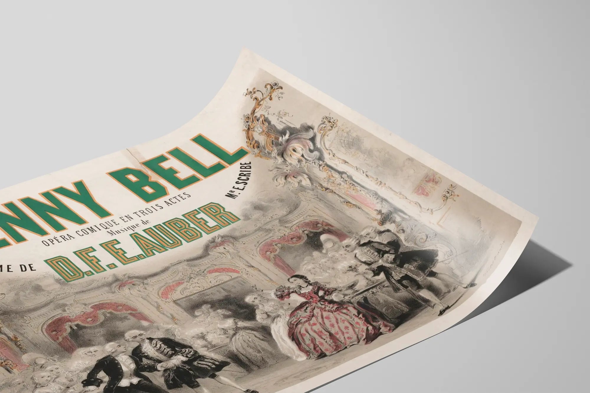 Ontdek deze vintage affiche gewijd aan de komische opera in drie bedrijven "Jenny Bell". Deze poster benadrukt een weelderige barokke decoratie, met een levendige scène van een elegante avond waarop personages in historische kostuums een rijk versierde zaal sieren. De muurschildering roept een verfijnde en aristocratische sfeer op, perfect voor liefhebbers van operageschiedenis en klassieke decoratie.